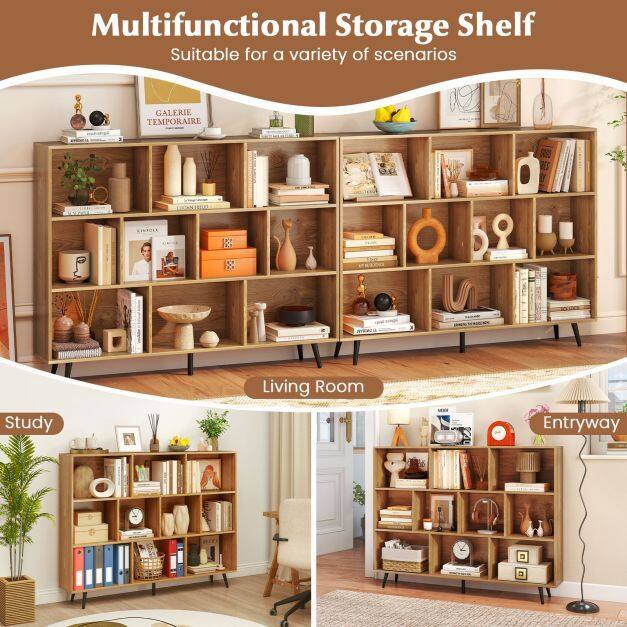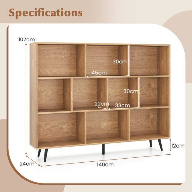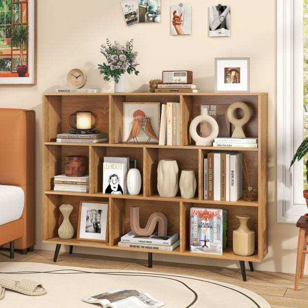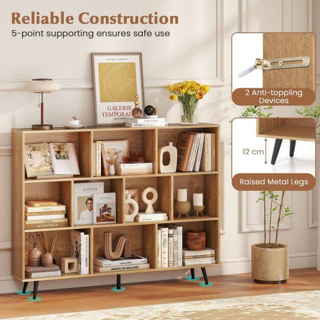 Elevate your sophistication with this ultra-chic cube bookcase that offers not just ample storage with its designer 10 compartments perfect for your beloved books, cherished photos, and crafts but also ensures a clutter-free sanctuary. Built to endure, thanks to premium materials and solid corner bracing with sturdy metal legs featuring non-slip security, this freestanding bookcase is as reliable as it is glamorous. Safety is a premium with 2 anti-tipping devices, ensuring your peace of mind. Plus, maintaining your stylish space is a breeze with its easy-clean surface and convenient under-space. Its mid-century charm makes it a versatile stunner, ready to beautify your bedroom, spruce up your office, or liven your living room!