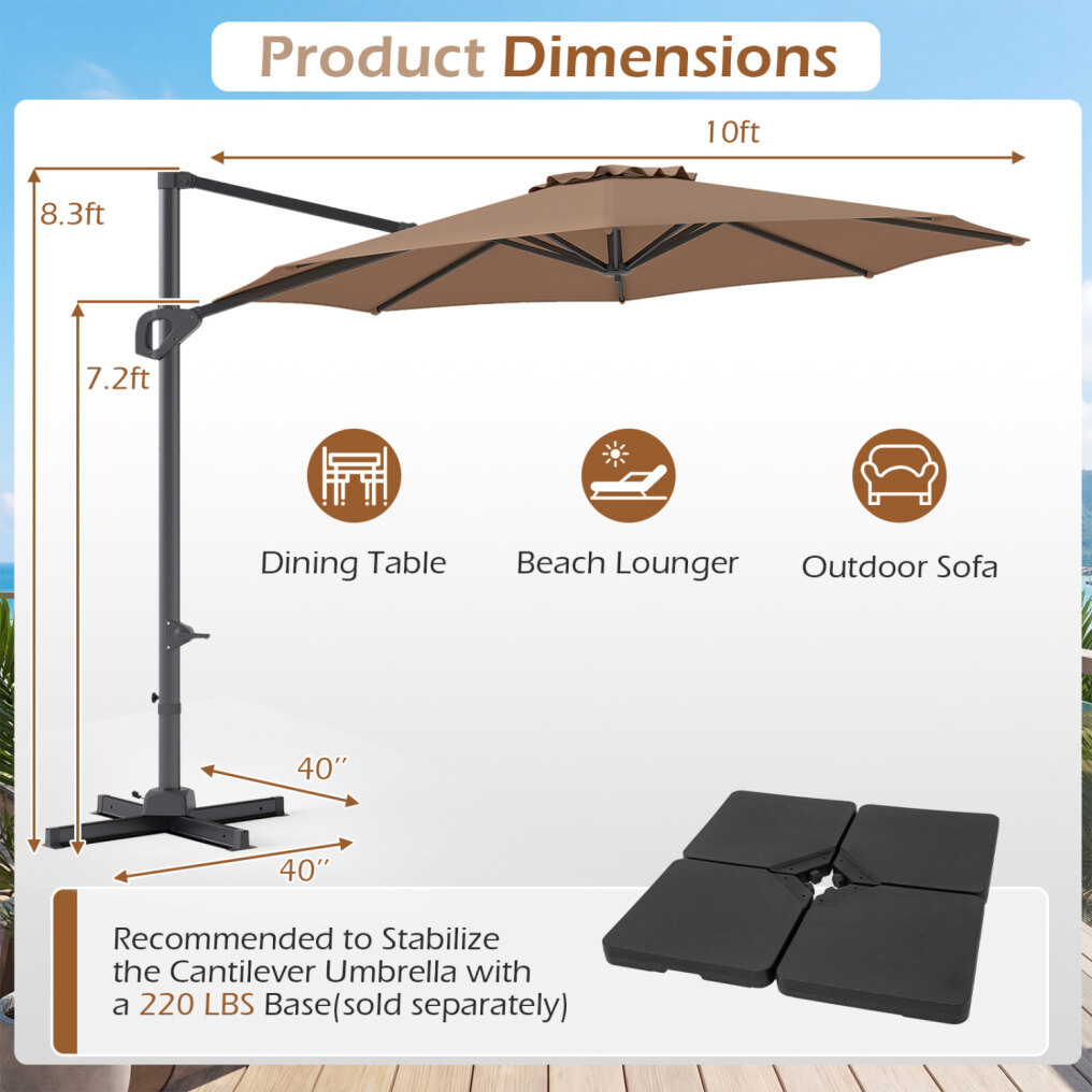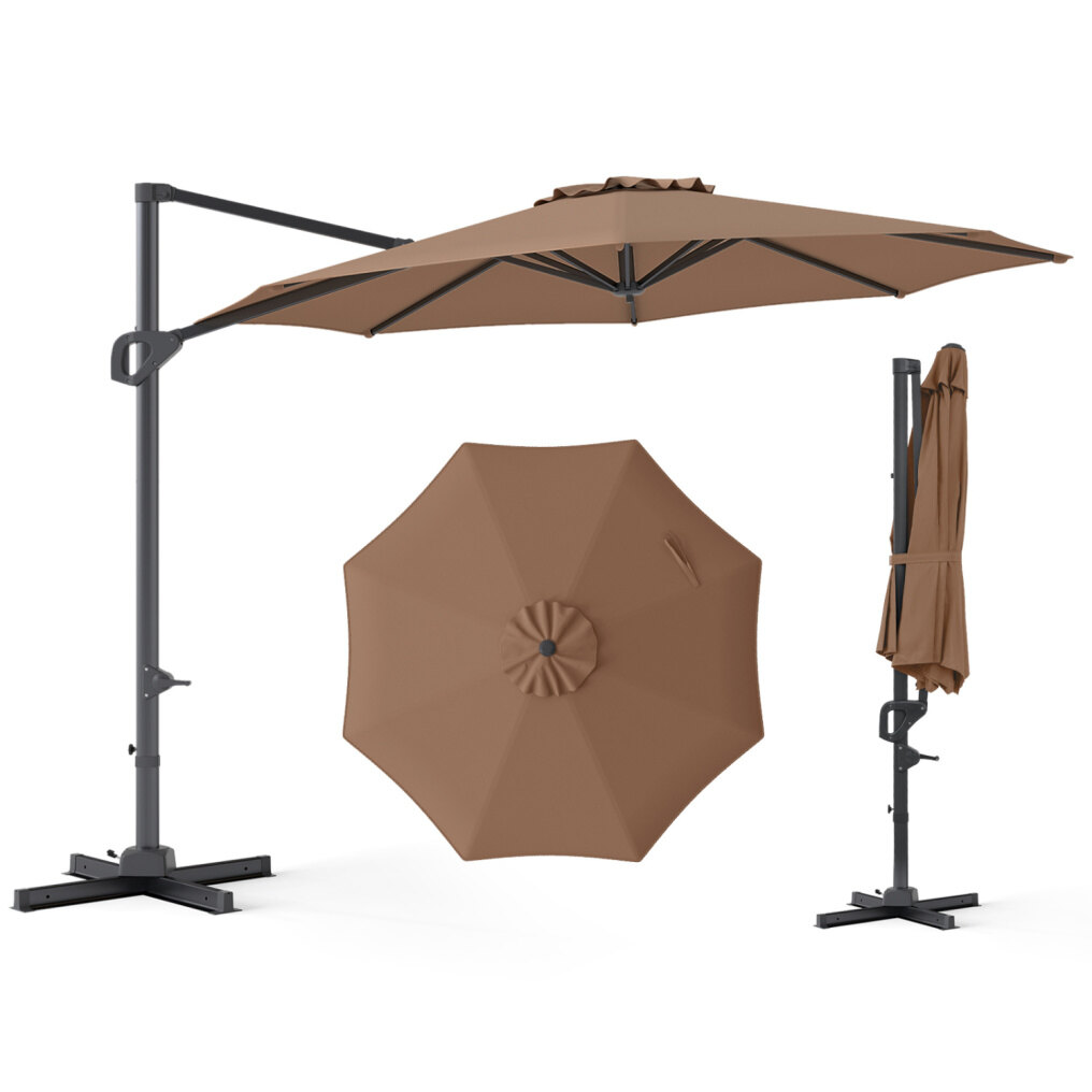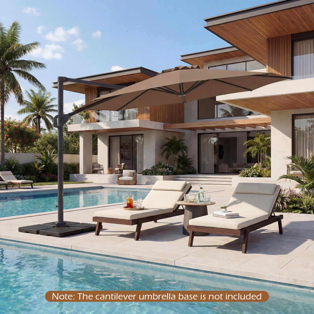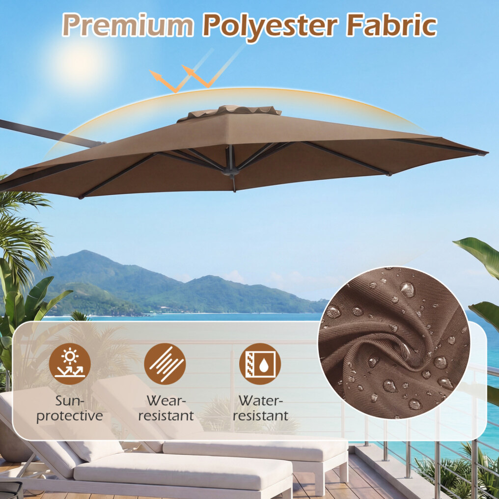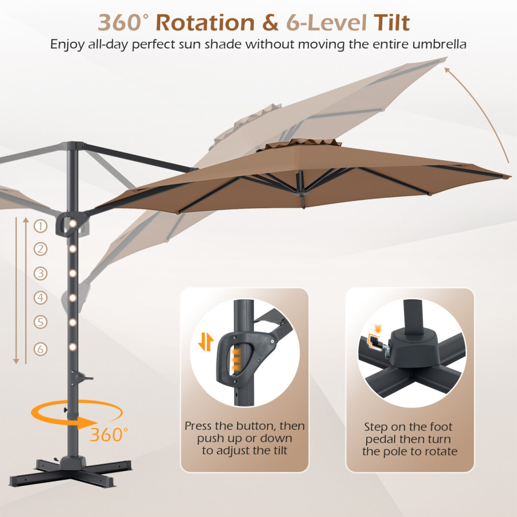 ● Easy Tilt and 360° Rotation: The cantilever umbrella features 6 adjustable tilt angles that allow the height and canopy angle to be tailored for optimal sun protection. The umbrella also rotates smoothly 360° using the convenient foot pedal, allowing shade to follow the sun throughout the day.
