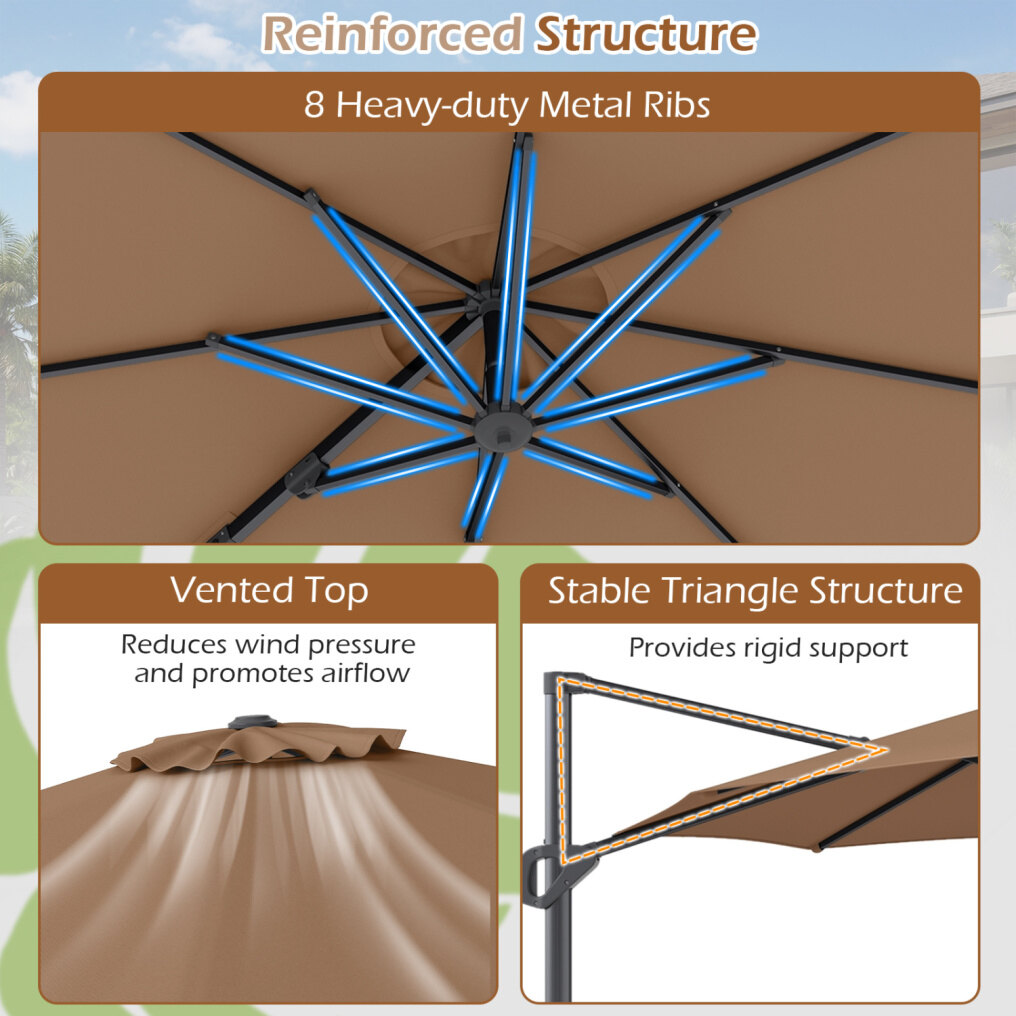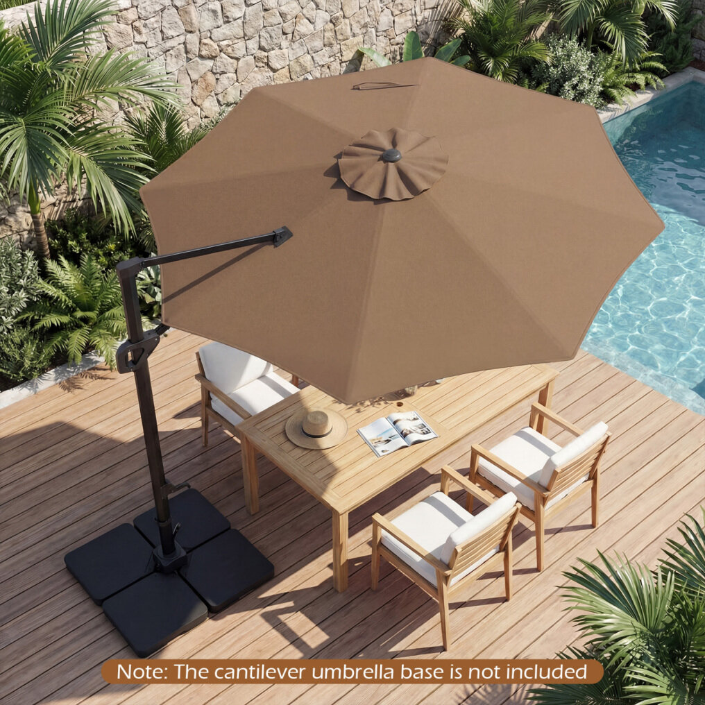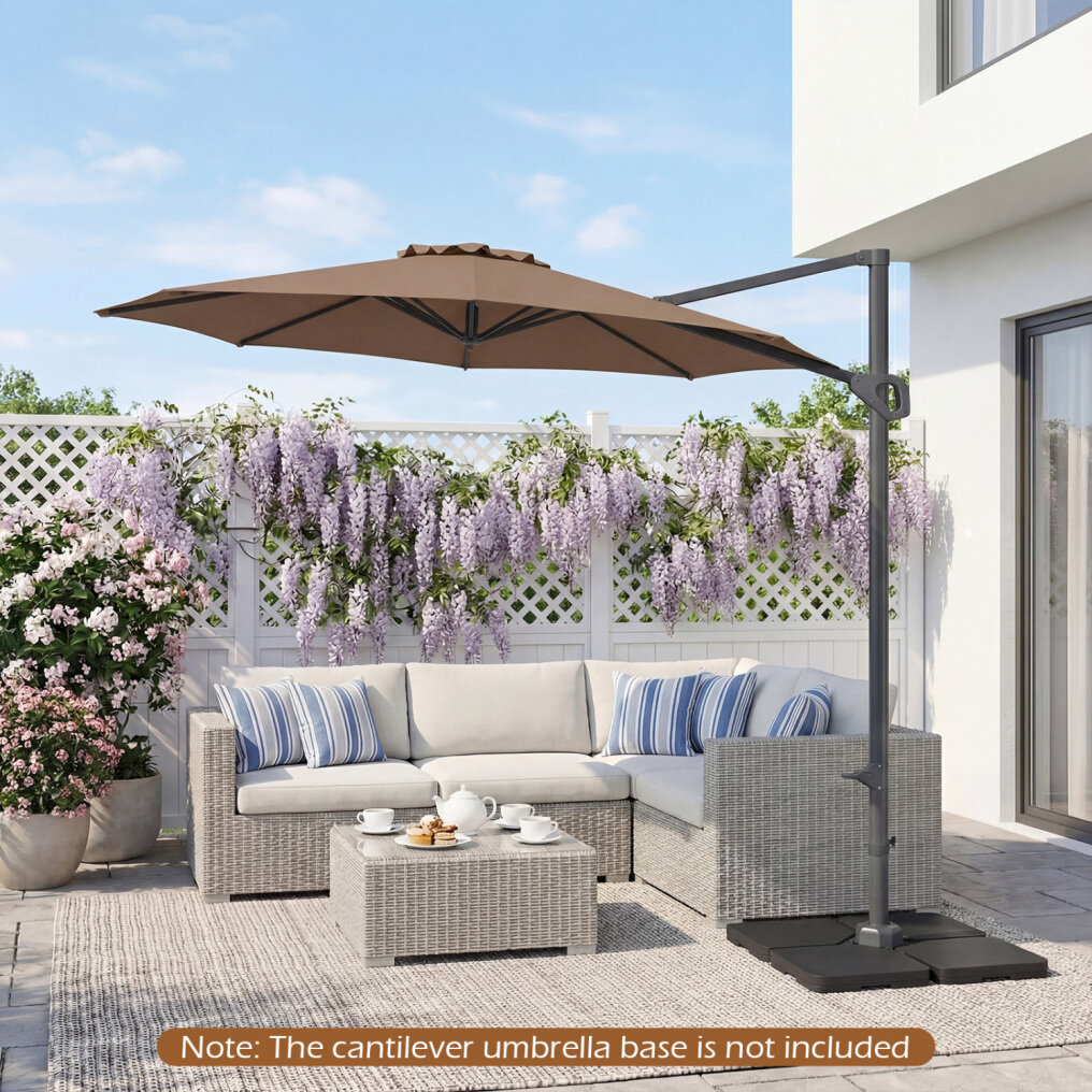● Robust and Reliable Structure: The outdoor parasol features 8 heavy-duty metal ribs and an aluminum pole that provide dependable support for the canopy. The vented top promotes airflow to enhance stability, while the included cross metal base pairs with a compatible cantilever umbrella base (not included) to create a more secure foundation.