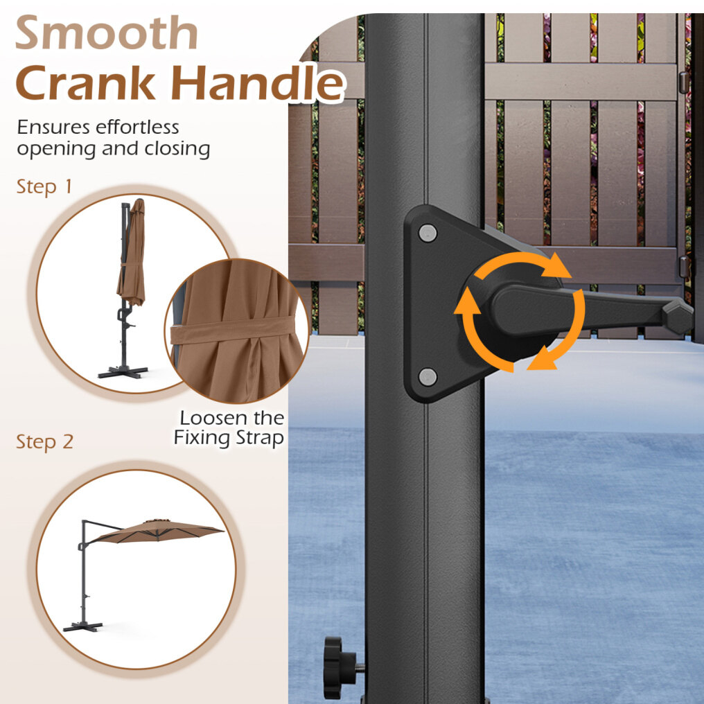 ● Smooth Crank Operation: This offset hanging umbrella incorporates a convenient crank mechanism that makes opening and closing the canopy smooth and effortless. Additionally, a built-in fixing strap helps secure the umbrella neatly when stored.