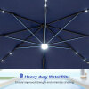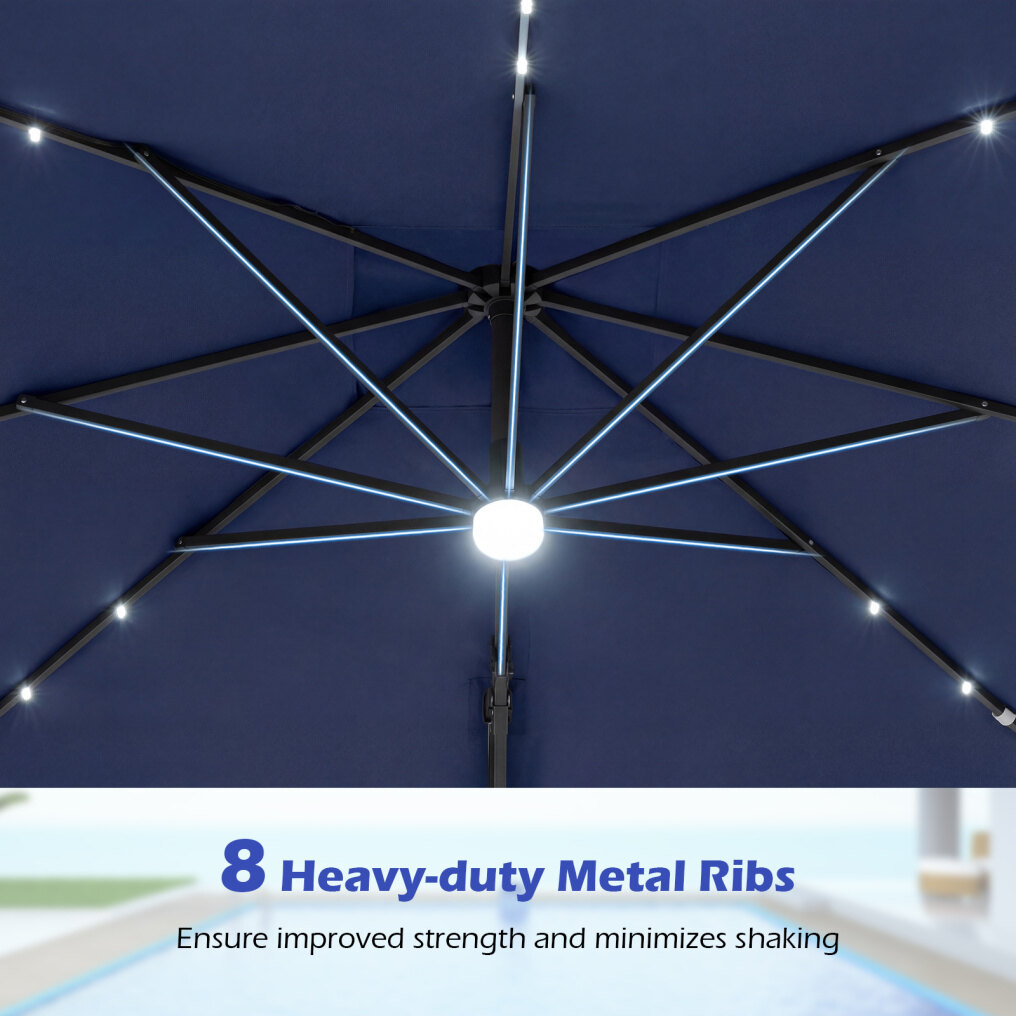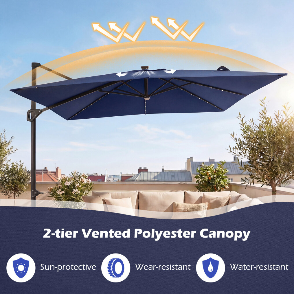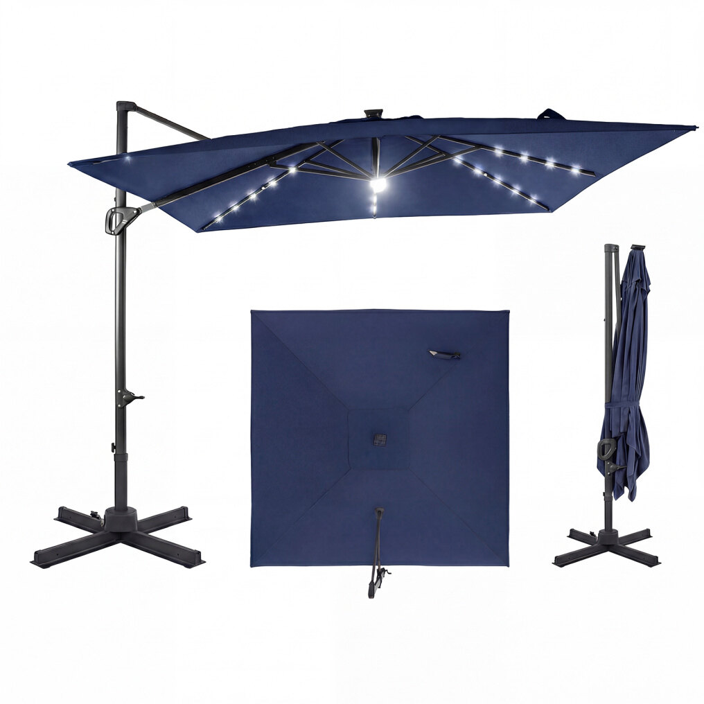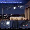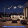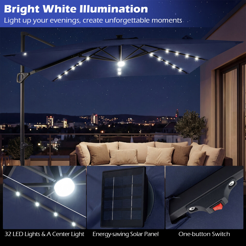● Solar Powered Lights: The cantilever patio umbrella comes with 32 LED lights along the ribs and a center light, providing pleasant illumination for evening gatherings. The built-in solar panel stores energy during the day and offers about 6-8 hours of lighting at night. For longer lighting performance, it is recommended to switch the lights off during daytime.