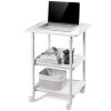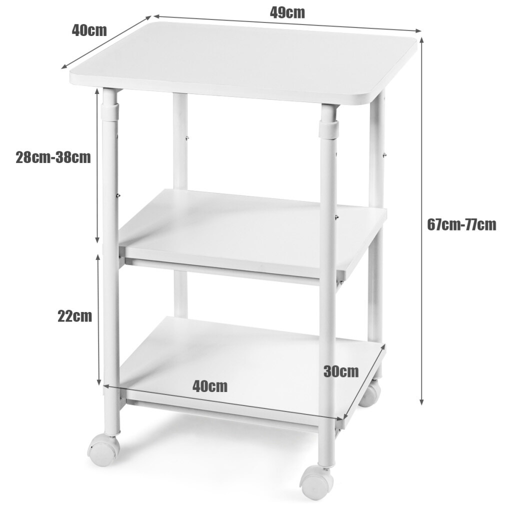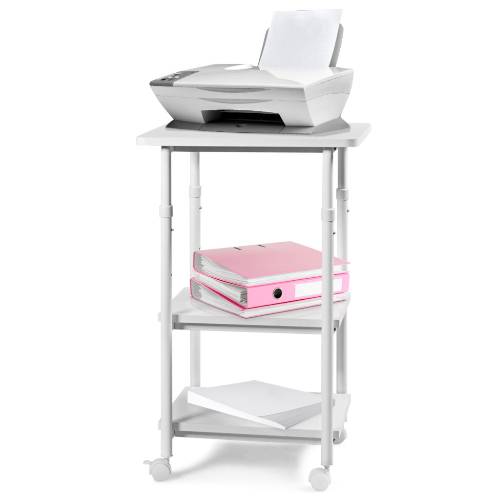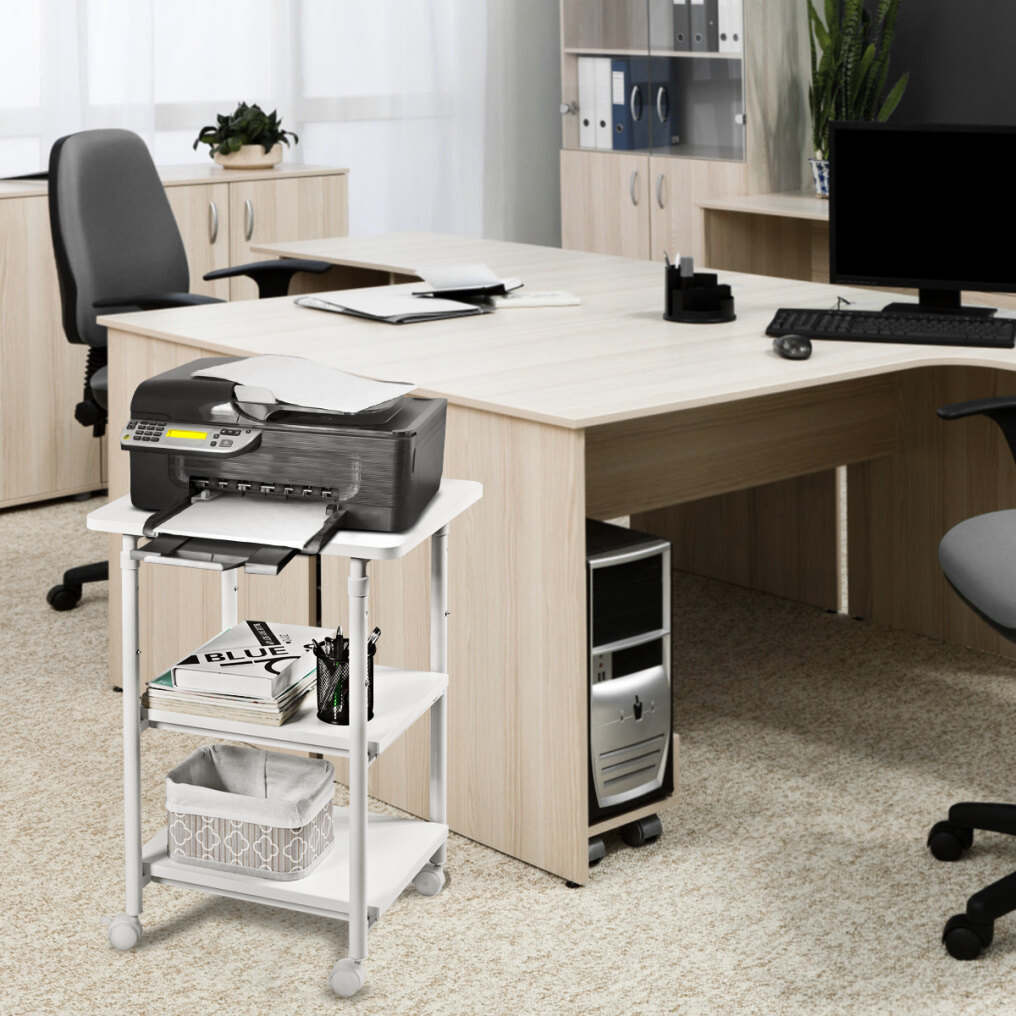 The 3-tier adjustable printer stand will be a perfect choice in your office, classroom and home. With adjustable height, the printer stand can be set at your desired height. 360° Swivel casters allow you to move the printer trolley around flexibly without scratching floor and 2 casters with brakes help you keep the printer stand in position on occasion. Made of heavy-duty steel pipes and thickened engineered wood, the printer cart is sturdy enough to support heavy printer, projector, let alone books and copy paper. Different kinds of office supplies can be placed on the board shelves to keep what you want within arm’s reach while freeing up more work space. Bring the rolling printer stand to your home office, so there is no need to transport printer supplies from one room to another room anymore.
