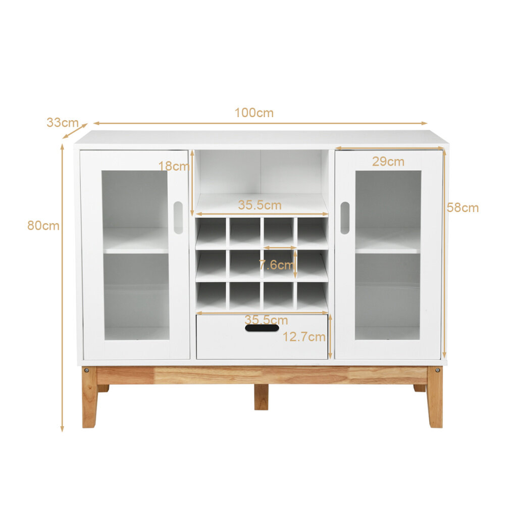 Professional Wine Storage Cabinet: This wine sideboard comes with 12 wine grids, which is fairly enough for users to store wine and other liquor bottles. 12 wine racks measure 7.6cm(L) X 7.6cm(W) that offering wine bottles a perfectly storage space, and giving wine completely stable support and great protection.