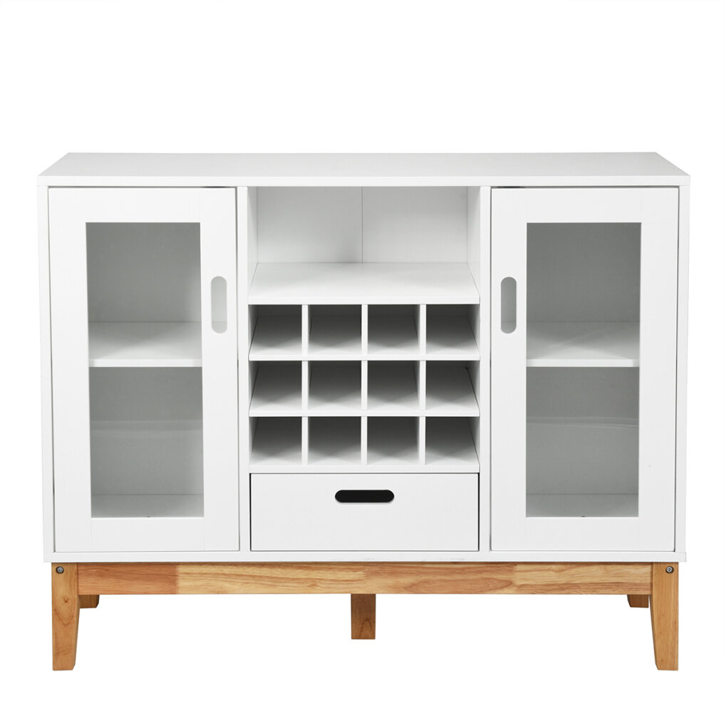 Multifunctional Storage Space: Featuring with 12 bottle wine racks, 2 side cabinets, open shelf and one large drawer, this wine storage cabinet provides you with display and storage spaces for various items. And 2 large capacity cabinets with transparent door can be used for storing daily necessities such as snacks, cups, tableware and more.