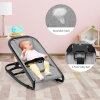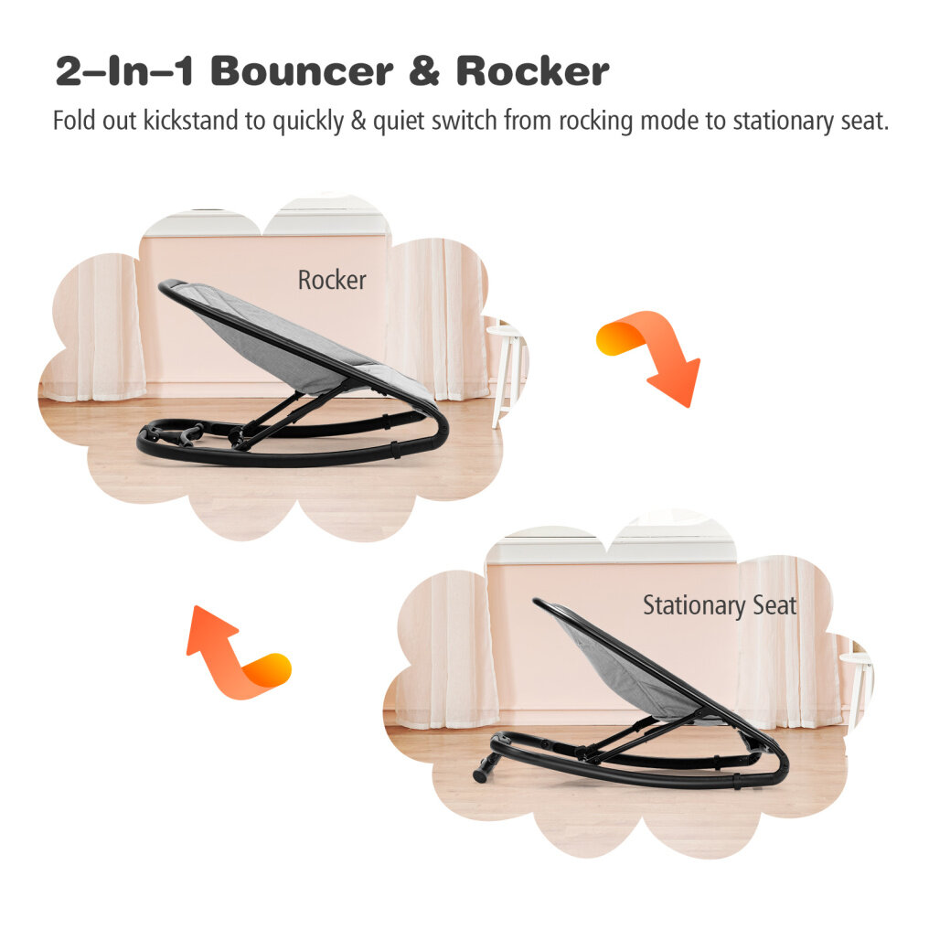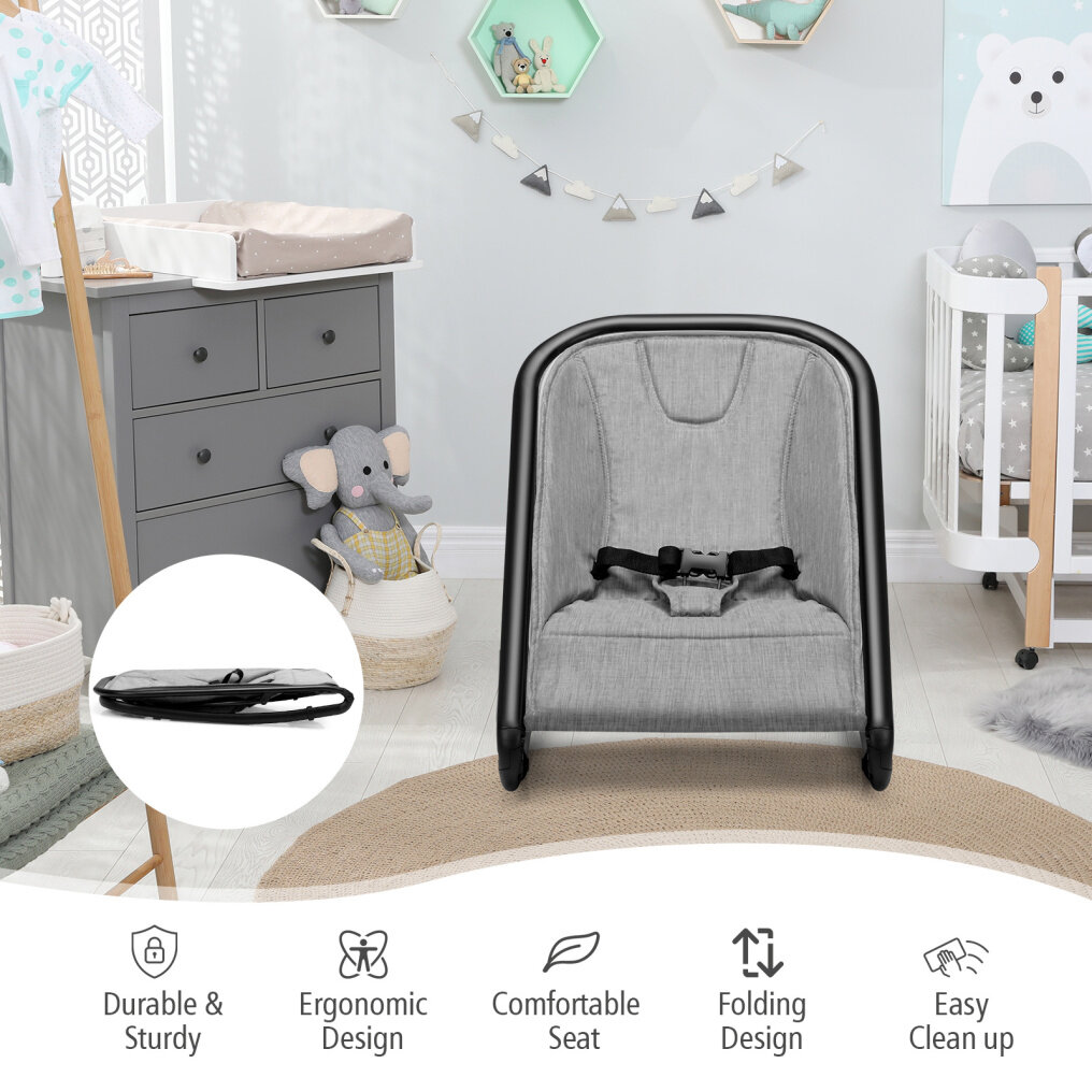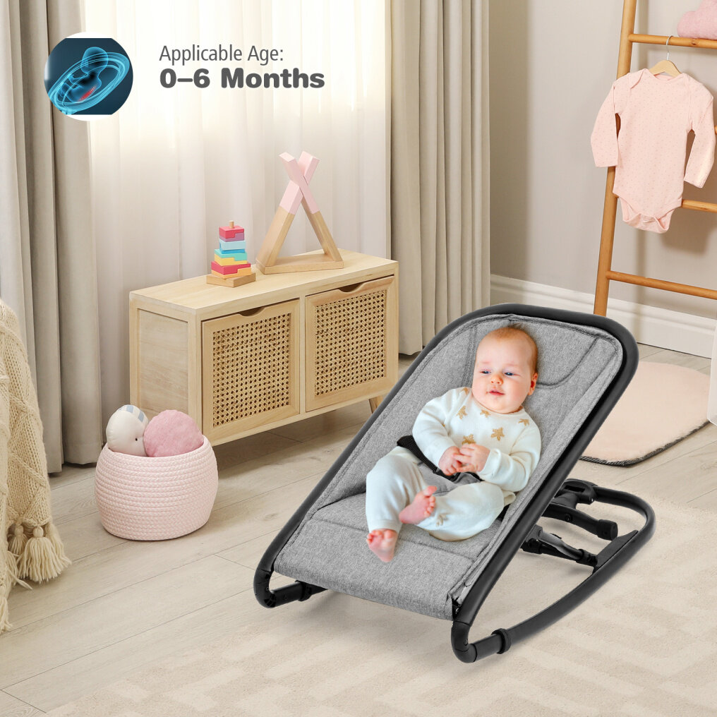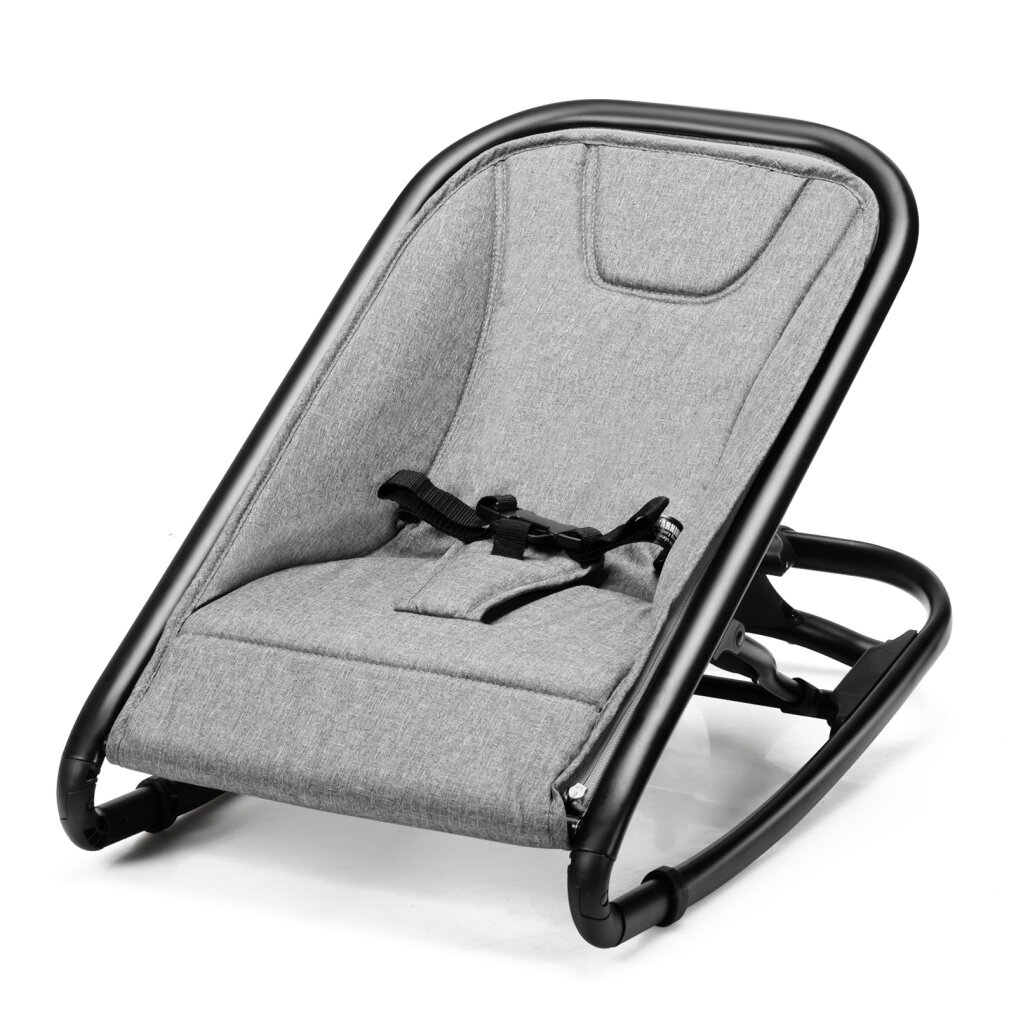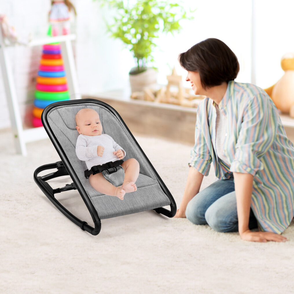 The 2-in-1 baby bouncer creates an ideal place for newborns to lounge, rock or sleep safely and comfortably. This sturdy baby bouncer in aluminum construction offers your little one 2 positions of recline to optimize their comfort level. The fabric back allows for increased airflow and great comfort, while the entire cover can be removed for machine washing. The 3-point harness will keep your little one securely in place. No matter what you need to do around the house, you can rest assured knowing your baby can sit or rock away in peace. Babies not only have a ton of fun while strapped into this bouncer, but it can help them develop balance, stability, strength, and motor skills. More importantly, the infant rocker folds completely flat for storage or for travel.