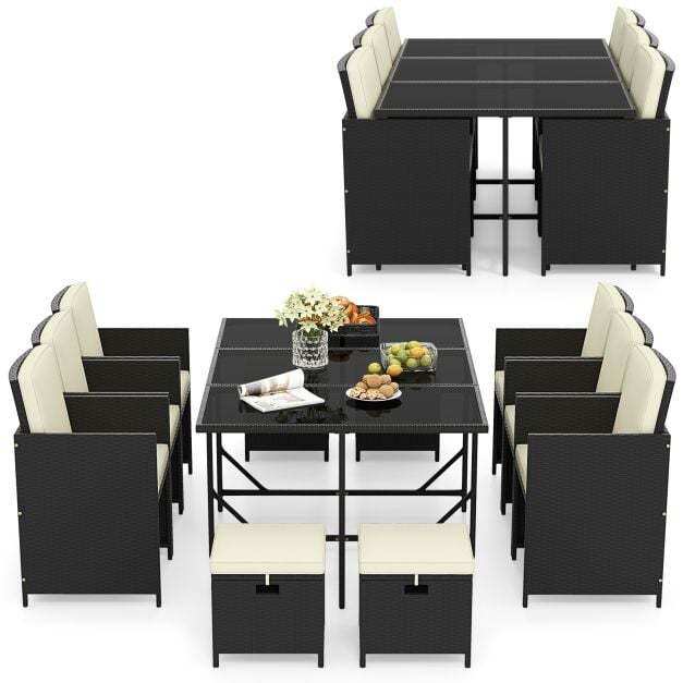 When not in use, the 11 pcs patio dining set can be quickly transformed into a space-saving state within 2 steps.(STEP 1: Put the backrest of the chair down; STEP 2: Put the cushion on the back and put the ottoman under the seat.) Featuring breathable rattan material, the outdoor furniture set provides comfort for all your outdoor events. And the PE rattan is non-fading for long lifespan. For improved comfort, the wicker chairs are equipped with slanted backrests and armrests for upgraded relaxation. And there are stools to rest your legs. The chairs are supported by cross metal pipes for added load-bearing. Besides, the dining table with metal legs and adjustable foot pads will enhance stability. Moreover, you can enjoy a luxurious seating experience with our sponge-filled cushions and pillows that provide added comfort. Whether you have a garden, yard, patio, or poolside area, our wicker conversation set is a versatile and stylish addition that will enhance your outdoor oasis.