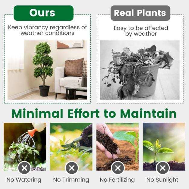 Easy Shaping and Maintenance: Please simply fluff the leaves after receive the fake indoor and outdoor plant to achieve the maximum coverage. If any leaves fall off during this process, they can be reinserted. And if the leaves get dusty, you can easily wipe it off with a wet cloth.