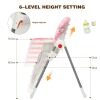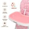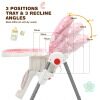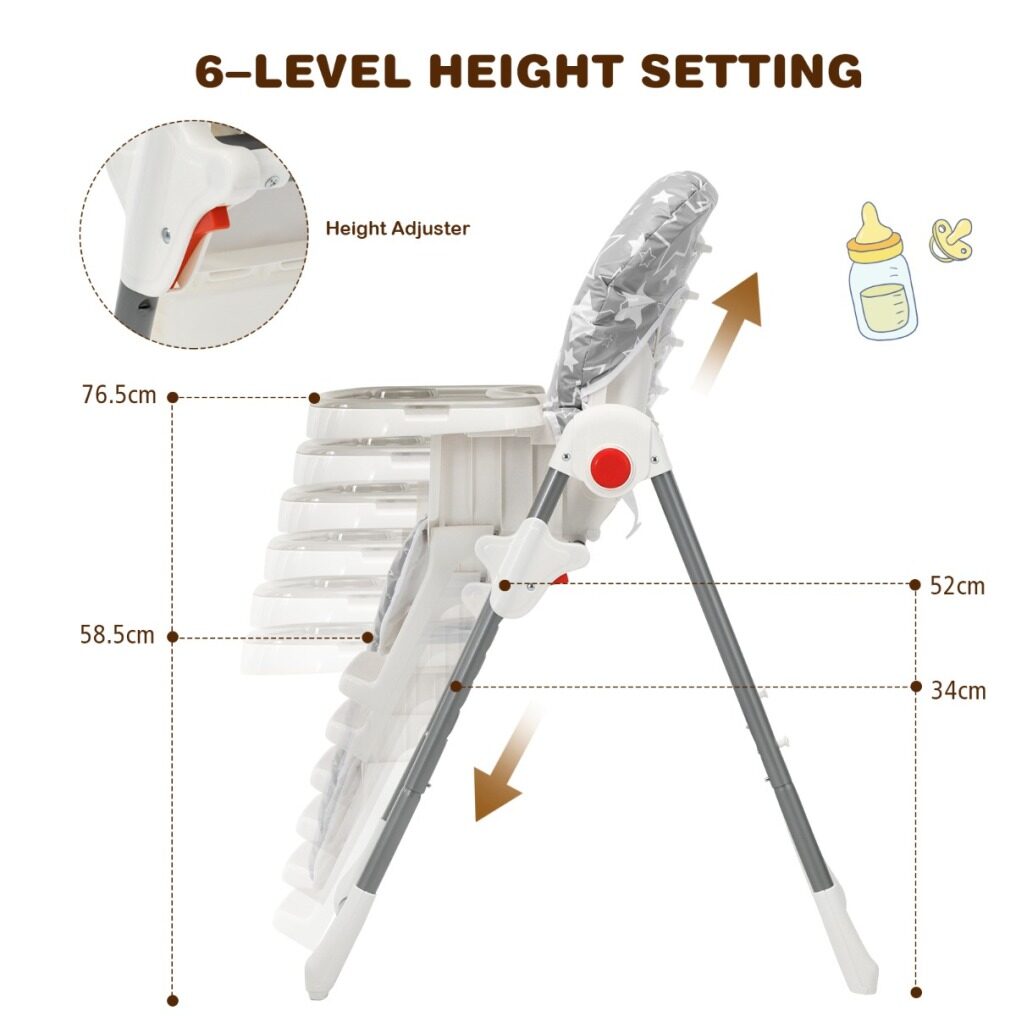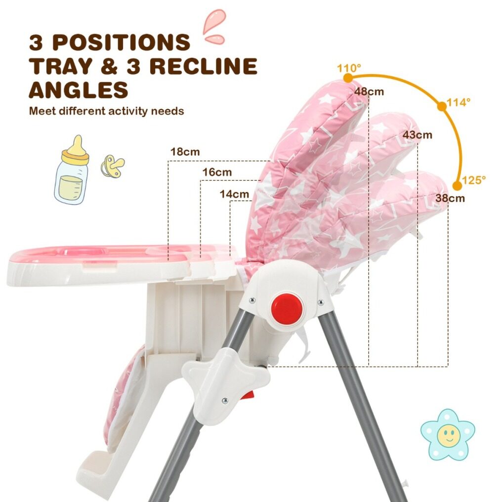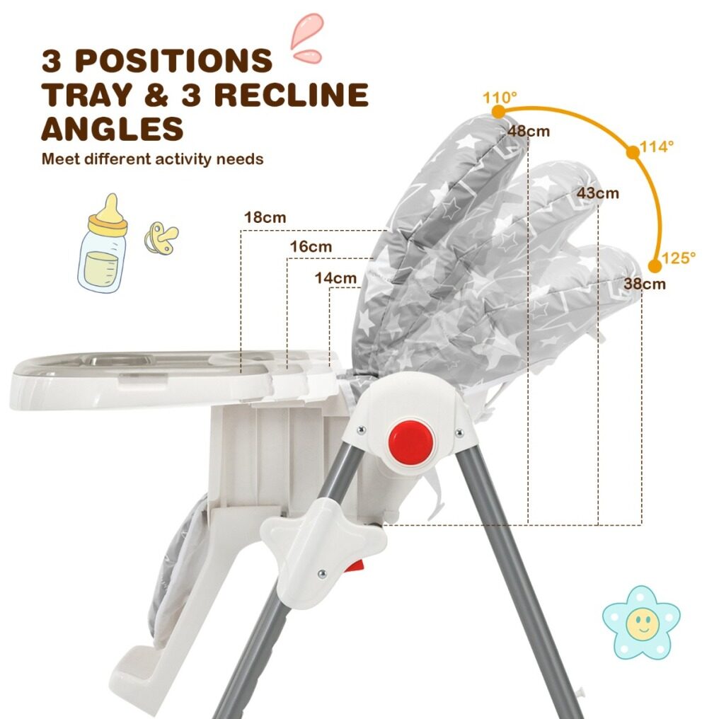 6-Level Adjustable Heights & 3 Backrest Angles: This baby highchair features 6-level height adjustment within the range of 86.5cm-107cm easily by pressing the buttons on both sides. The adjustable backrest can be freely selected between 110°, 114° and 125° to meet the needs of different activities.