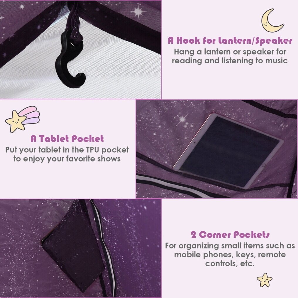 Made of tear resistant polyester fabric and supported by sturdy fiberglass poles, this indoor tent is not easy to crack or deform, and can withstand long-term use. During the day, it can be used as a recreational tent. The transparent TPU bag can hold your tablet to play your favorite TV shows. Two corner pockets can be used to store small items such as mobile phones and remote controls. You can also play music by hanging the speaker on the top hook. At night, it will provide you with a warm sleeping environment, and the air vent on the top of the tent can promote the circulation of fresh air. When not in use, it can be folded easily and for storage and carrying.