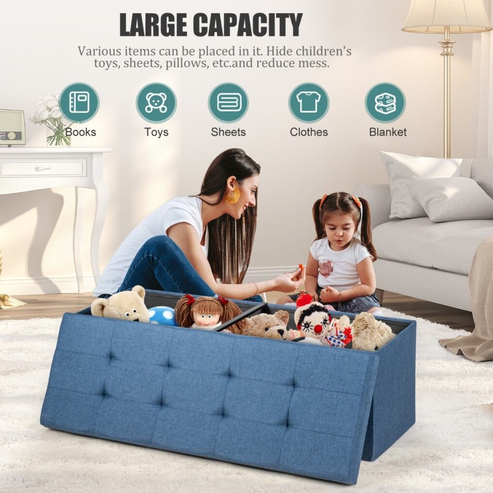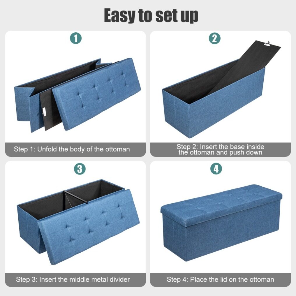 The overall frame is constructed of high-quality MDF, which ensures a high load bearing capacity without easy deformation. Soft fabric covering and thick padding provide a great sitting experience. Roomy interior storage space can meet the needs of storing clothes, blankets, shoes and other daily necessities. It’s also worth mentioning that the metal divider provides added stability and can realize classified storage. Besides, equipped with detailed instructions, this storage ottoman can be assembled quickly.