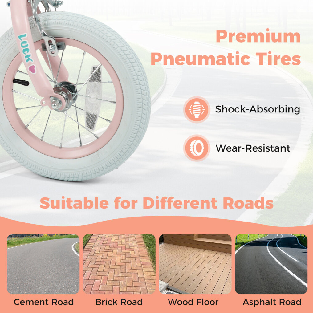 Safe and Steady Riding Experience: Equipped with anti-crack and shock-absorbing tires, the kids bike ensures a smooth and steady ride on asphalt roads, cement roads, brick roads, and more. 2 detachable training wheels help beginners keep balance and pedal independently. Moreover, there are front and rear reflectors as well as wheel reflector to keep kids visible when they ride at night, adding security.