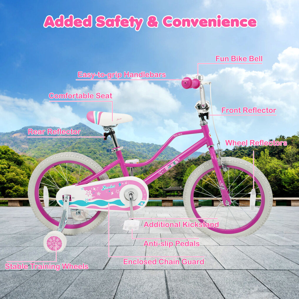 ● Added Safety Protection: The removable training wheels ensure extra balance for beginners, allowing your little one learn to pedal independently. The enclosed chain guard prevents accidental pinching. The kids bike also comes with front reflector, rear reflector, and wheel reflectors to keep your child visible to add more safety. Kickstand allows your kids to stop the bike (Only available for 18-inch bikes).