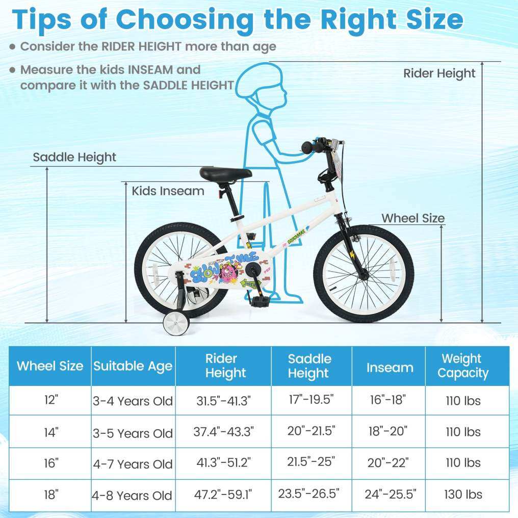 Tips of Choosing the Right Size: Please measure the kids inseam and compare it with the saddle height of this bicycle to ensure a comfortable and ergonomic fit. Consider the ride height more than age. Proper sizing is crucial for a safe and enjoyable riding experience, especially for young children learning to cycle.