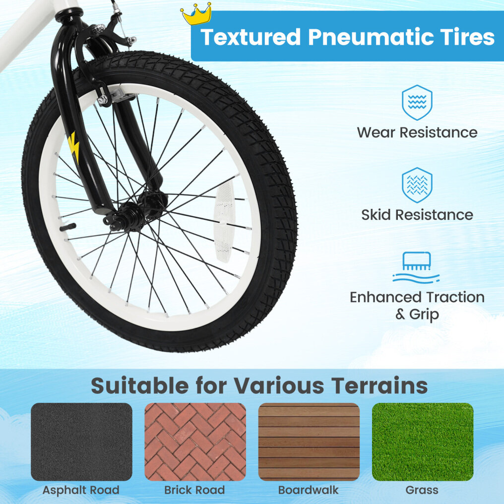 All-Terrain Stability: This kids bike boasts textured pneumatic tires that provide impressive wear resistance, skid resistance, enhanced traction and grip for absolute confidence under any adventure. It's built to perform over asphalt roads, brick roads, boardwalks, grass, and more.