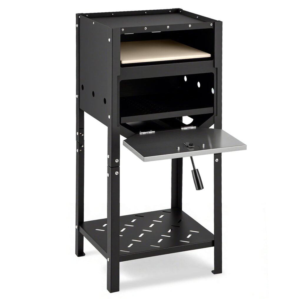 ● User-Oriented Design: Designed with user convenience in mind, this outdoor pizza oven features anti-scalding handles for safe usage, stable supporting legs for added stability, and a pull-out drawer for easy ash collection. The top tray for accessory storage and bottom shelf for wood storage enhance functionality.