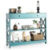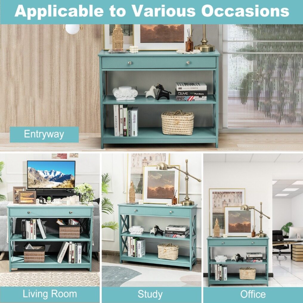 Designed with a spacious tabletop, a large drawer, and 2 storage shelves, this wooden table comes with ample storage space for your belongings, such as keys, sunglasses, photos, and more. This premium entryway table is durable, stable enough to hold up to 209 lbs. Measuring 39'' x 12'' x 31'' (L x W x H), this 3-tier table will make for a timeless addition to your living room, hallway, or entryway.