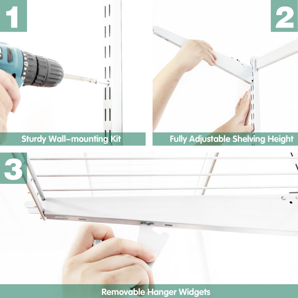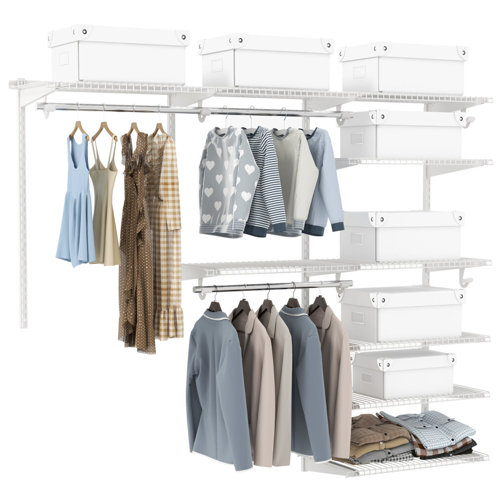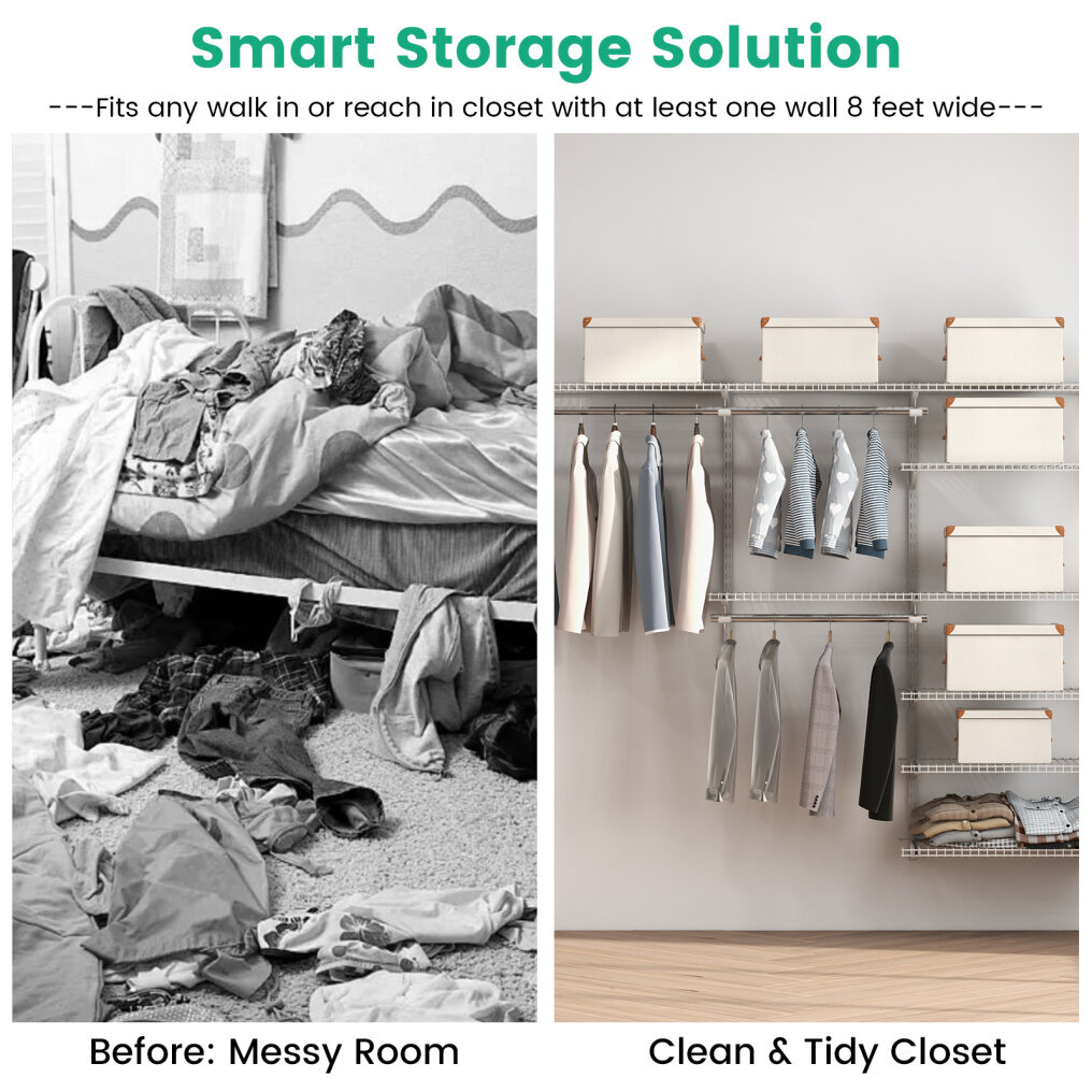 ● Smart Height Adjustable Shelving: The wire shelving closet kit is a simple and economical solution to organizing your closet and utilizing limited room space. Featuring flexible installation height and vertically/horizontally adjustable mesh shelving/clothing rods, it is convenient for you to change the closet layout according to your storage needs.