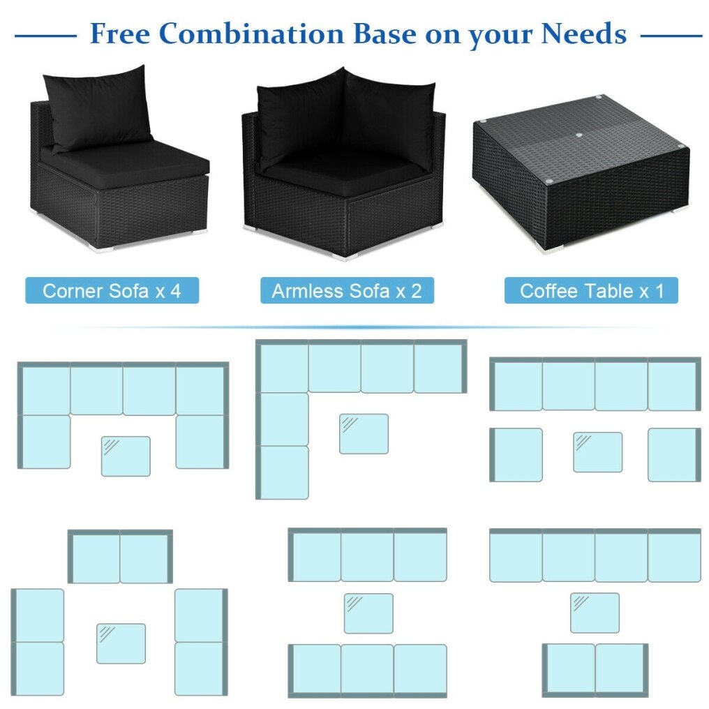 ● Free Combination of Sectional Sofa: Comes with four armless sofas, two corner sofa and a coffee table, this patio furniture can flexible combination according to your needs and based on your room space. In addition, 10 clips secure the sofa firmly together to avoid sliding. The patio furniture set with ample seats allows you to relax with your friends.