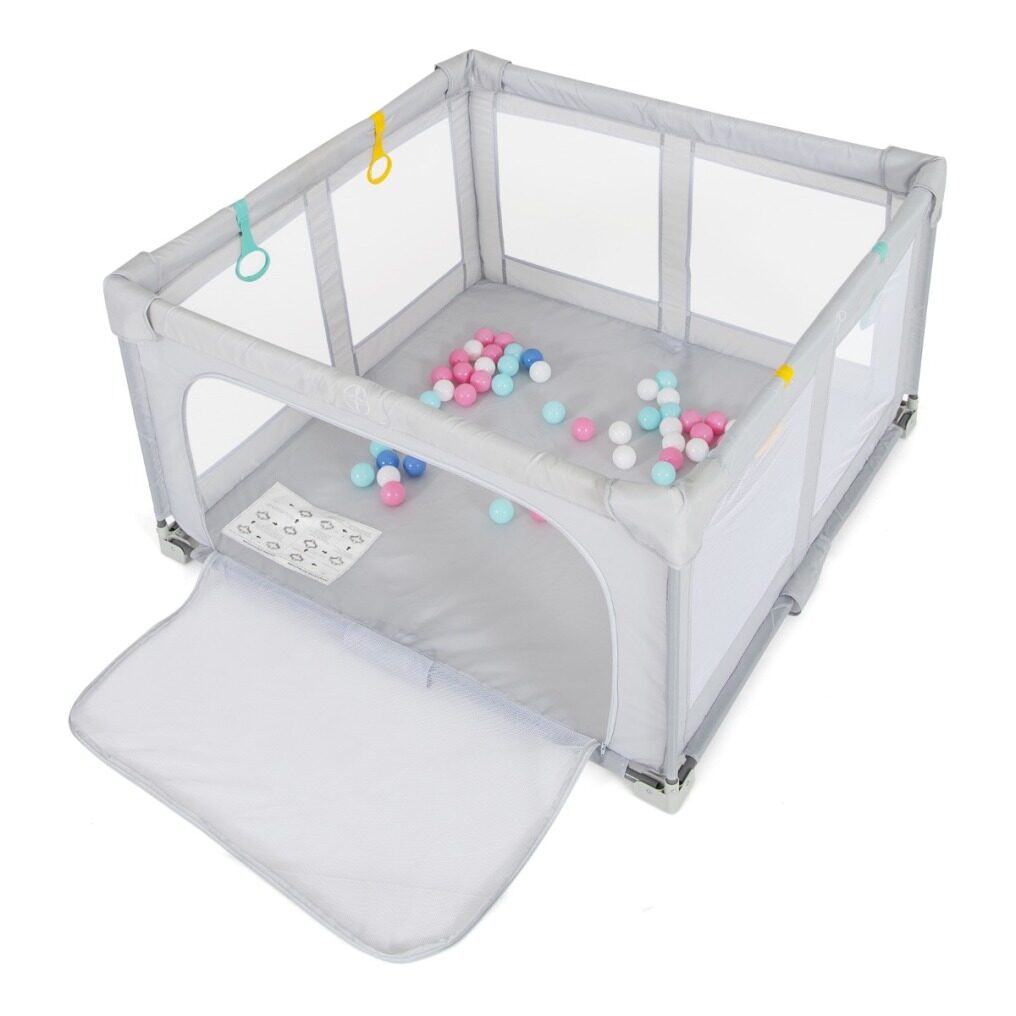 This large playard offers enough space for your little one to explore, and joints are wrapped by foam to prevent the baby from hitting the head. Parents can easily interact with their children through the see-through mesh. The play yard includes 50 ocean balls and 4 pull-up rings for physical activity and motor skills development. This foldable play pen requires no assembly, making it convenient for transport and storage with the included carry bag.
