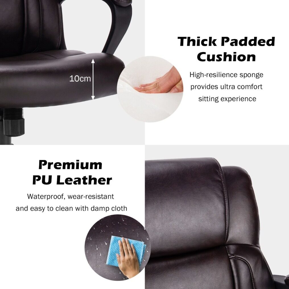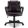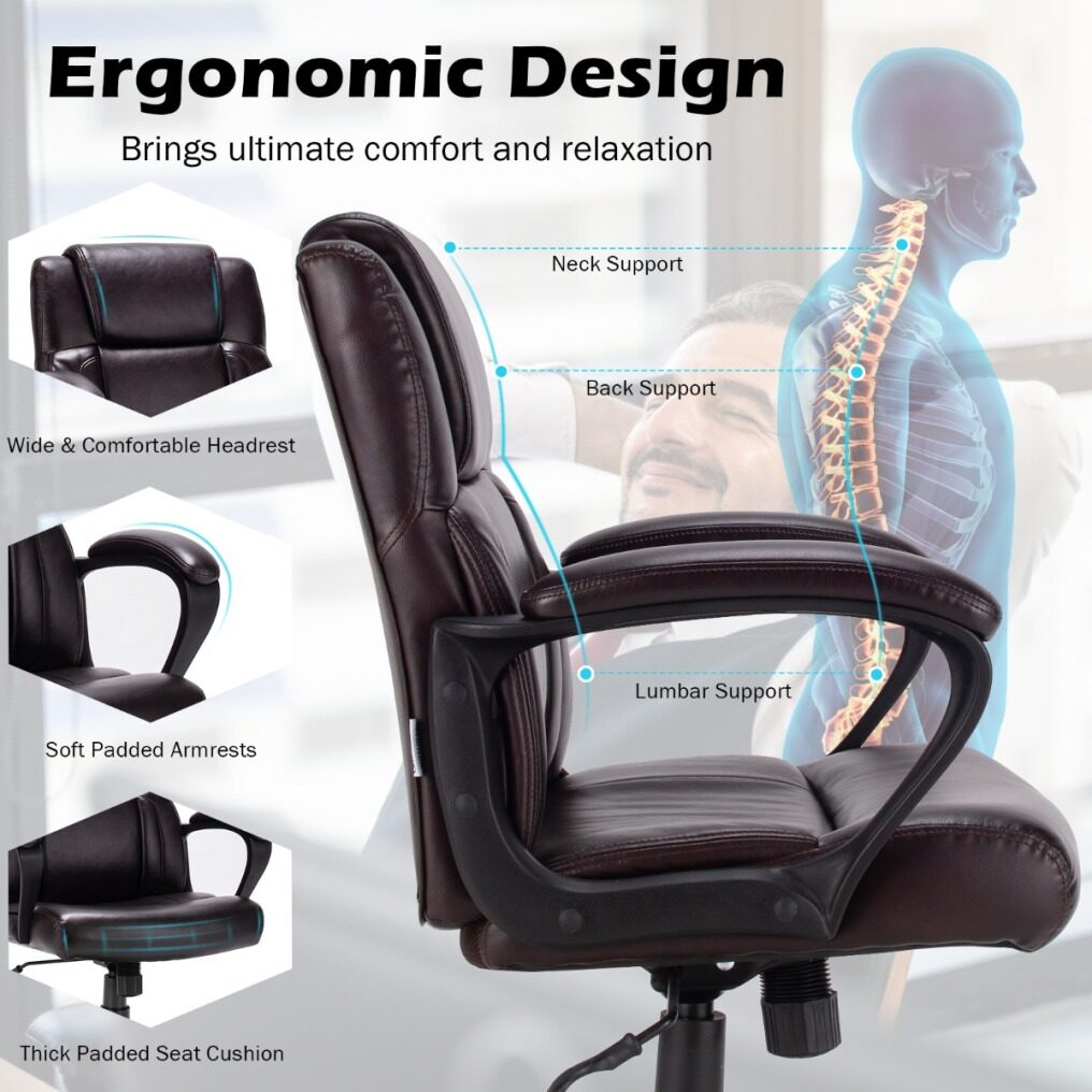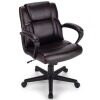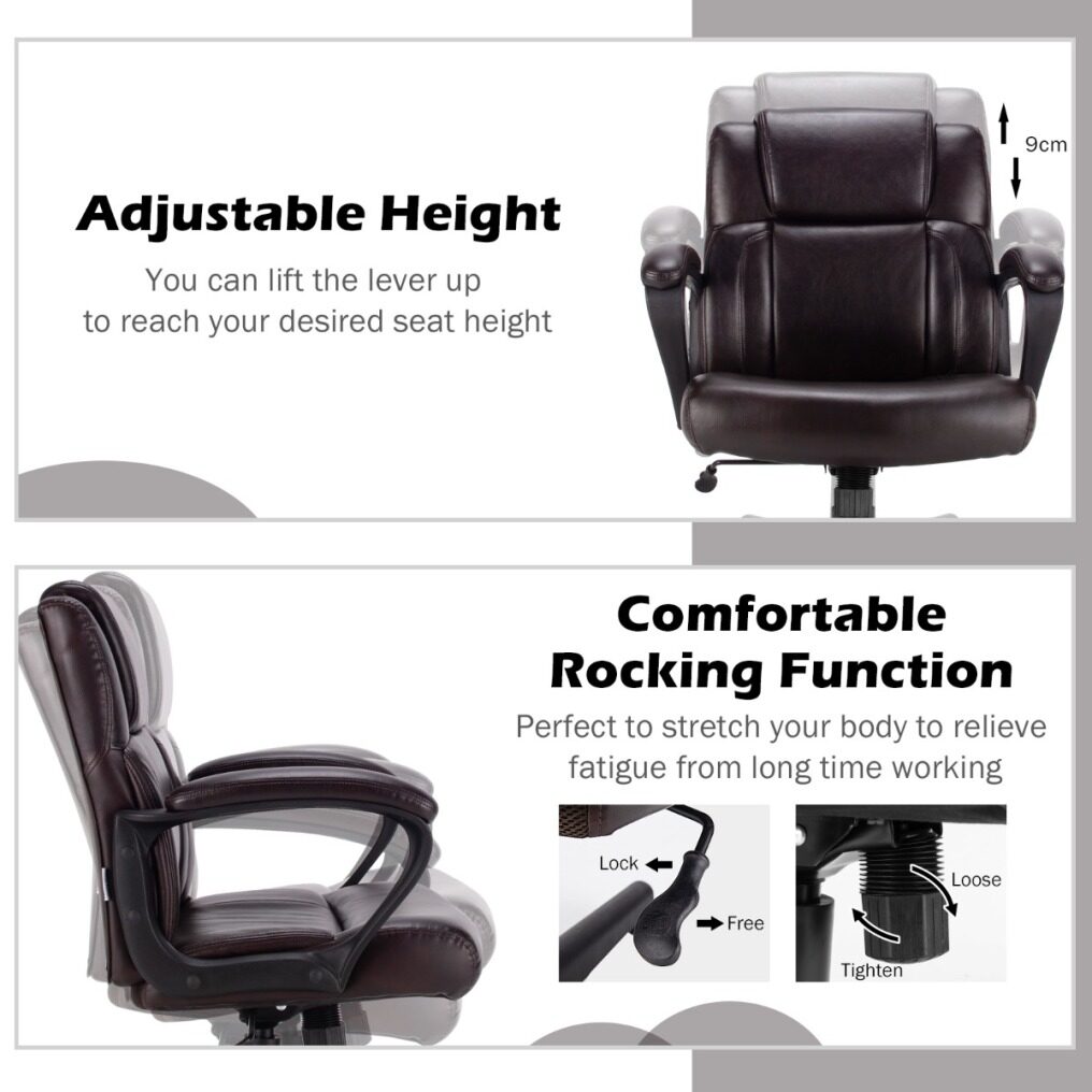 The leather desk chair combines stylish design with comfortable sitting feeling. Supported by a sturdy 5-claw base and a high quality SGS certified gas rod, this office chair is strong and safe enough to hold up to 136 kg. With ergonomic design, the mid back chair provides optimal back and lumbar support, extremely alleviating the fatigue after a long day’s work. The smooth PU leather upholstery offers you a soft touch. And the seat height can be easily adjusted to meet your ideal position. What's more, 5 flexible wheels make the chair easy to move around. This swivel executive chair is definitely a perfect addition to your house and office!