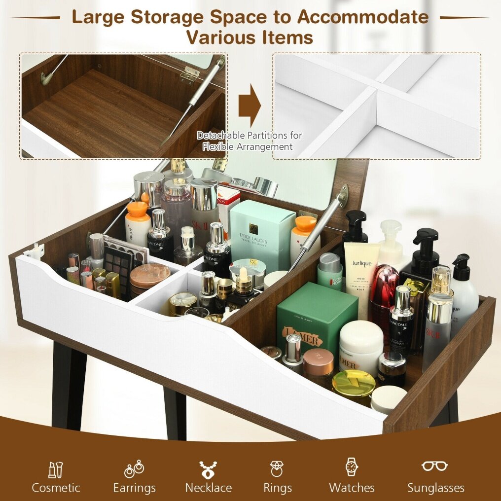 This dressing table is equipped with a flip-top mirror. The pneumatic lift system and the buffer design are really helpful to protect the hinges and the wood boards. What’s more, solid wood legs and anti-skid pads make it more stable for long-lasting service.