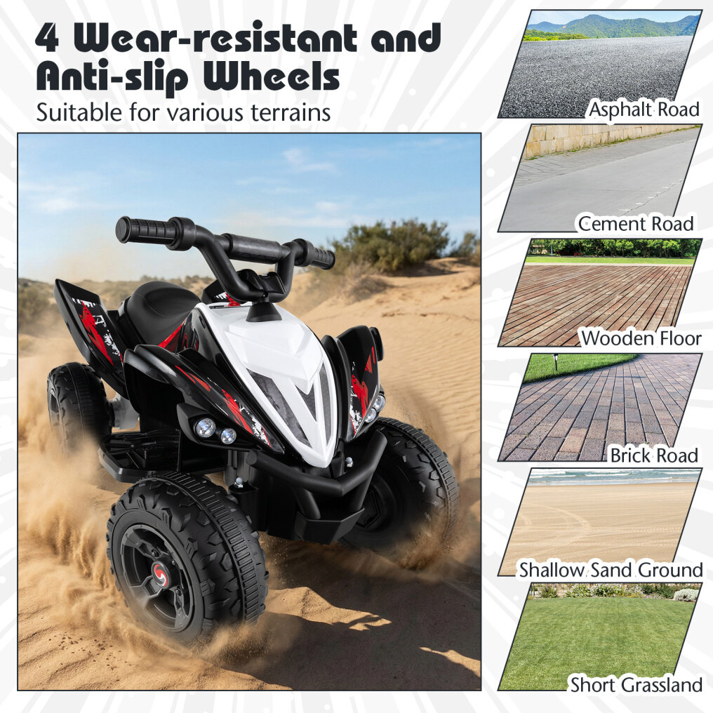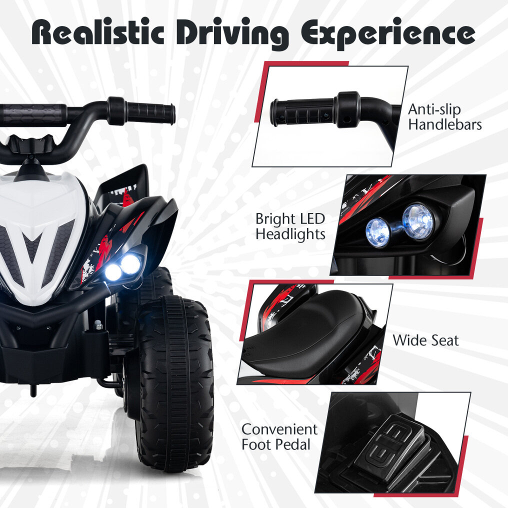 ● 4-Wheeler Ride on ATV: The kids ride on ATV allows little ones to experience excitement with its dual 15W powerful motors and a 12V/4.5Ah rechargeable battery, ensuring a robust and thrilling ride at 3-7 mph speed. Plus, the one-touch start foot pedal makes it easy for young racers to jump into action and enjoy the ride.