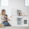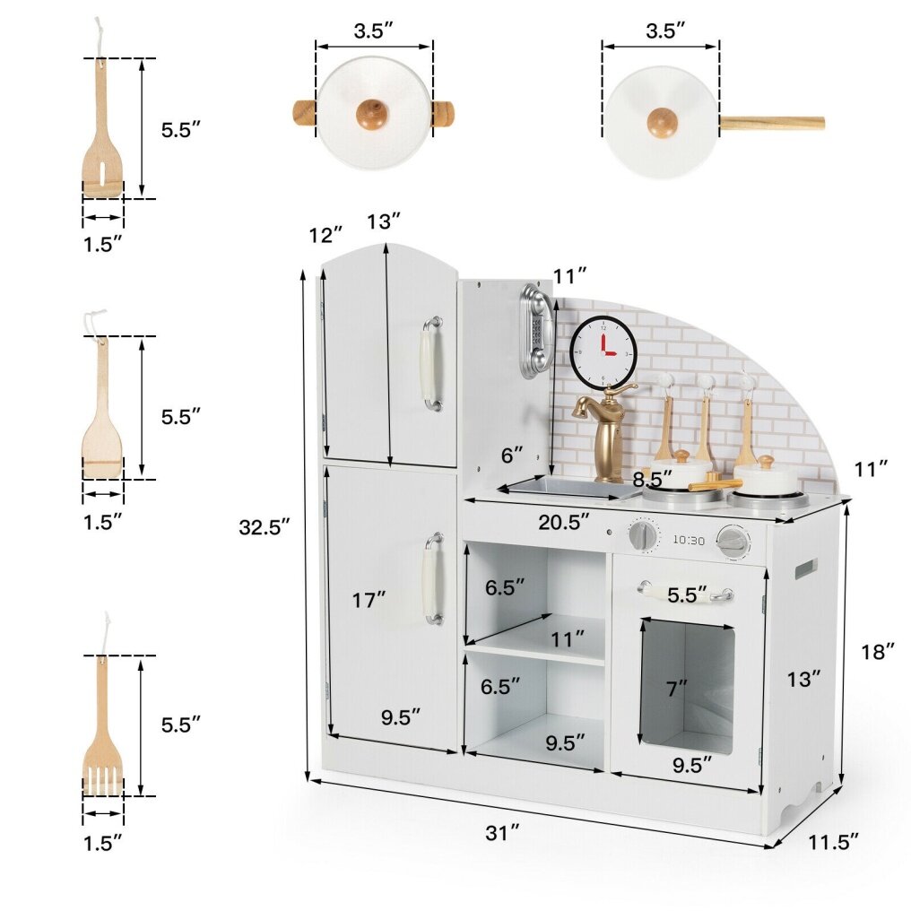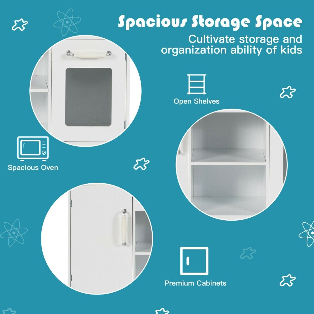 ● Classified Storage Space: Featuring multiple storage places including an oven, a 2-tier open shelf and two large cabinets, our play kitchen set will effectively cultivate your kid’s organization ability. Moreover, the kitchen playset is equipped with 1 pan, 1 pot and 3 spatulas, offering kids a chance to learn several basic cooking skills.