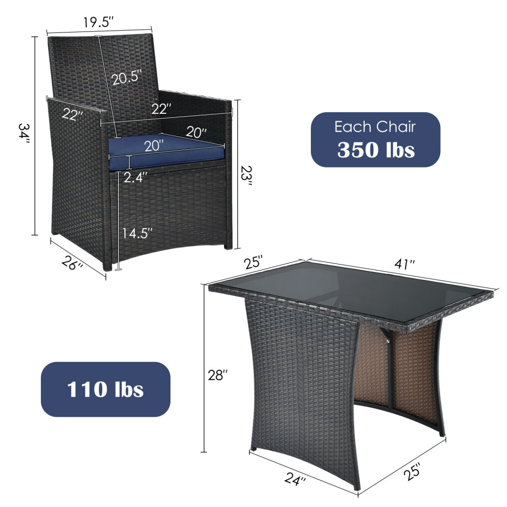 ● Easy Maintenance: Considering your convenience, the covers of cushions can be removed so that you are able to clean it with ease. Furthermore, the smooth tempered glass tabletop is also easy to maintain. Dimension of each chair: 26" x 22" x 34" (L x W x H), dimension of table: 41" x 25" x 28" (L x W x H), seat height from the ground: 16.5".