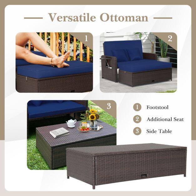 ● 3-in-1 Multifunctional Sofa Set: The combination of the loveseat sofa and ottoman allows you to use this patio set as a double chaise lounge / daybed. 4-level adjustable backrest allows you to sit, recline or lie flat for different outdoor activities. And the 2 retractable side trays make drinks and snacks easy to fetch. Moreover, when the ottoman cushion is removed, you can use this patio set as a double sofa with side table.
