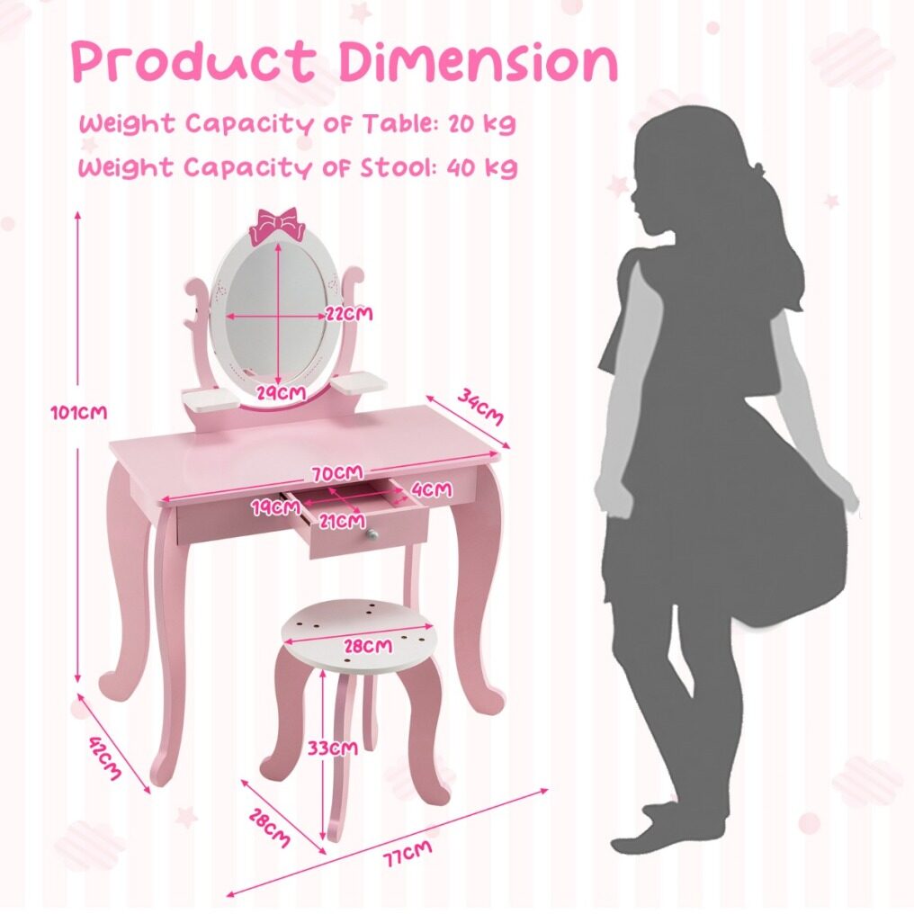 Considerate Details: The kids' vanity set is designed with smooth rounded corners for kids' safety. Moreover, the stable curved legs and the reinforced structure add to steadiness and security. The 360° rotatable mirror allows children to find the desired angle for a better user experience.