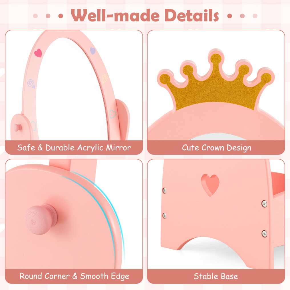 ● Cute and Attractive Appearance: This kids free-standing dressing mirror is in fancy pink, and the top golden crown perfect decorates the whole mirror. Such an elegant design is appealing to kids, and makes the mirror an ideal decoration for kids room.
