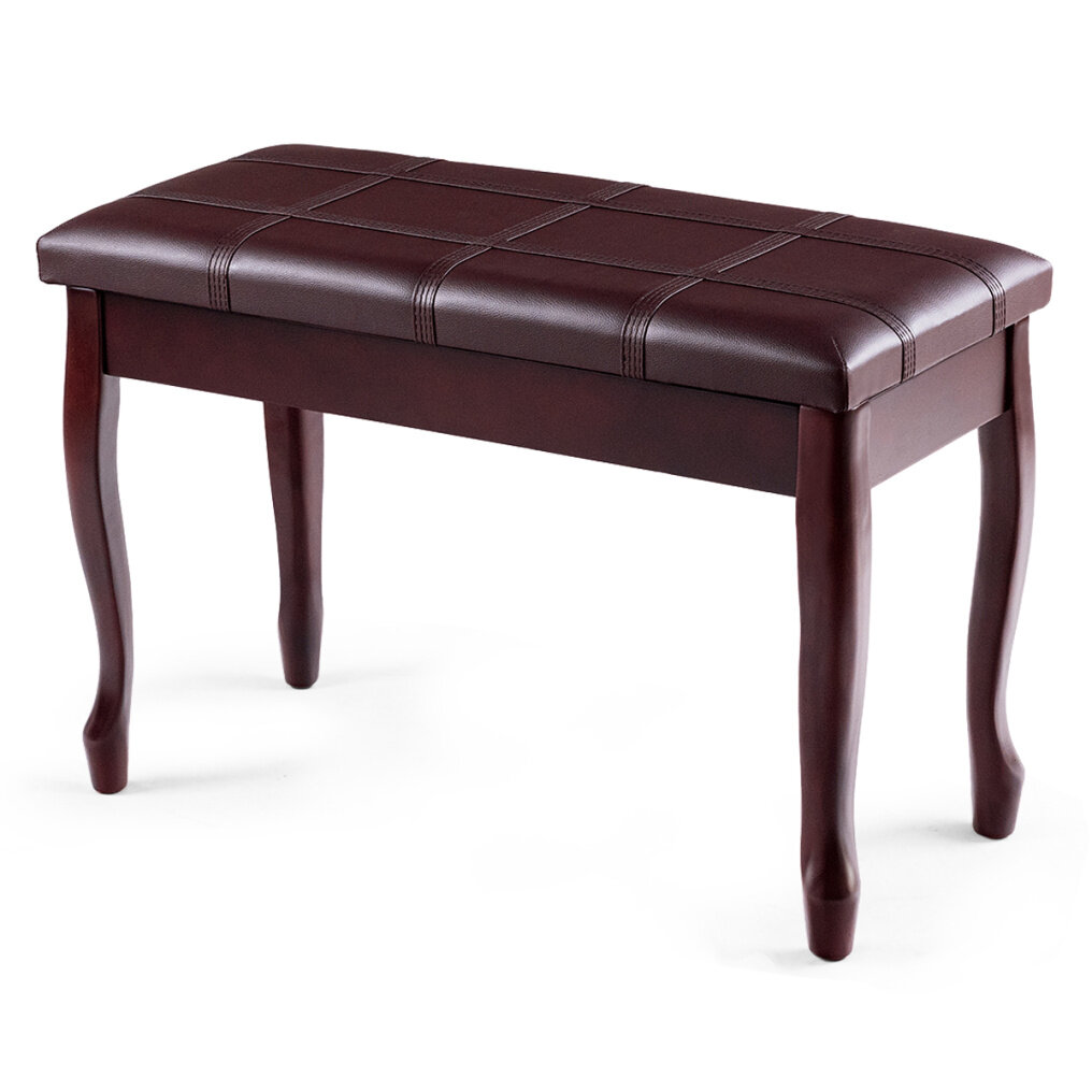 This is our high quality and stylish piano bench which offers a comfortable place for you to practice the piano. Constructed with sturdy solid wood, the piano bench can support two persons safely. Covered with PU leather and padded with high-resilience sponge, you will feel more enjoyable and relaxed. Equipped with a large storage compartment under the seat that provides specious space for holding sheet music and books. What's more, it has anti-slip feet pads under wooden legs, protecting your floor from being scratched. Don't hesitate to buy one!