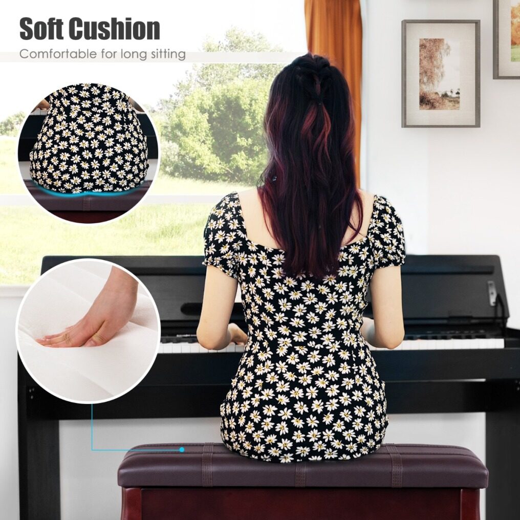 Padded Seat: Padded with high-resilience sponge and covered with soft PU leather, our piano bench makes you feel very comfortable even if practicing for a long time. Covered with PU leather, the piano bench is smooth enough to be kept clean.