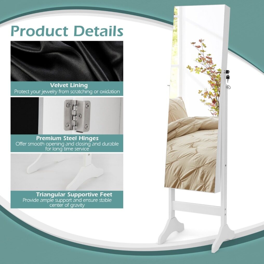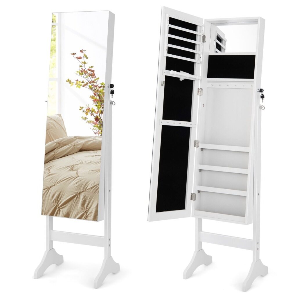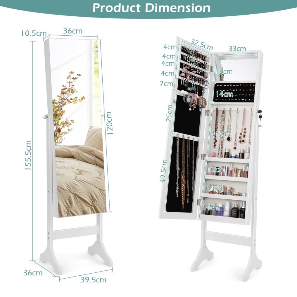 Adjustable Full-length & Frameless Mirror: The full-length mirror of this standing jewellery cabinet is frameless, which provides a wider view from head to toe comparing framed mirror. Also, the mirrored jewellery cabinet features 4 adjustable tilt angles, allowing you to find the desired angle according to your needs.
