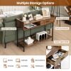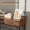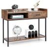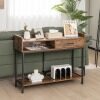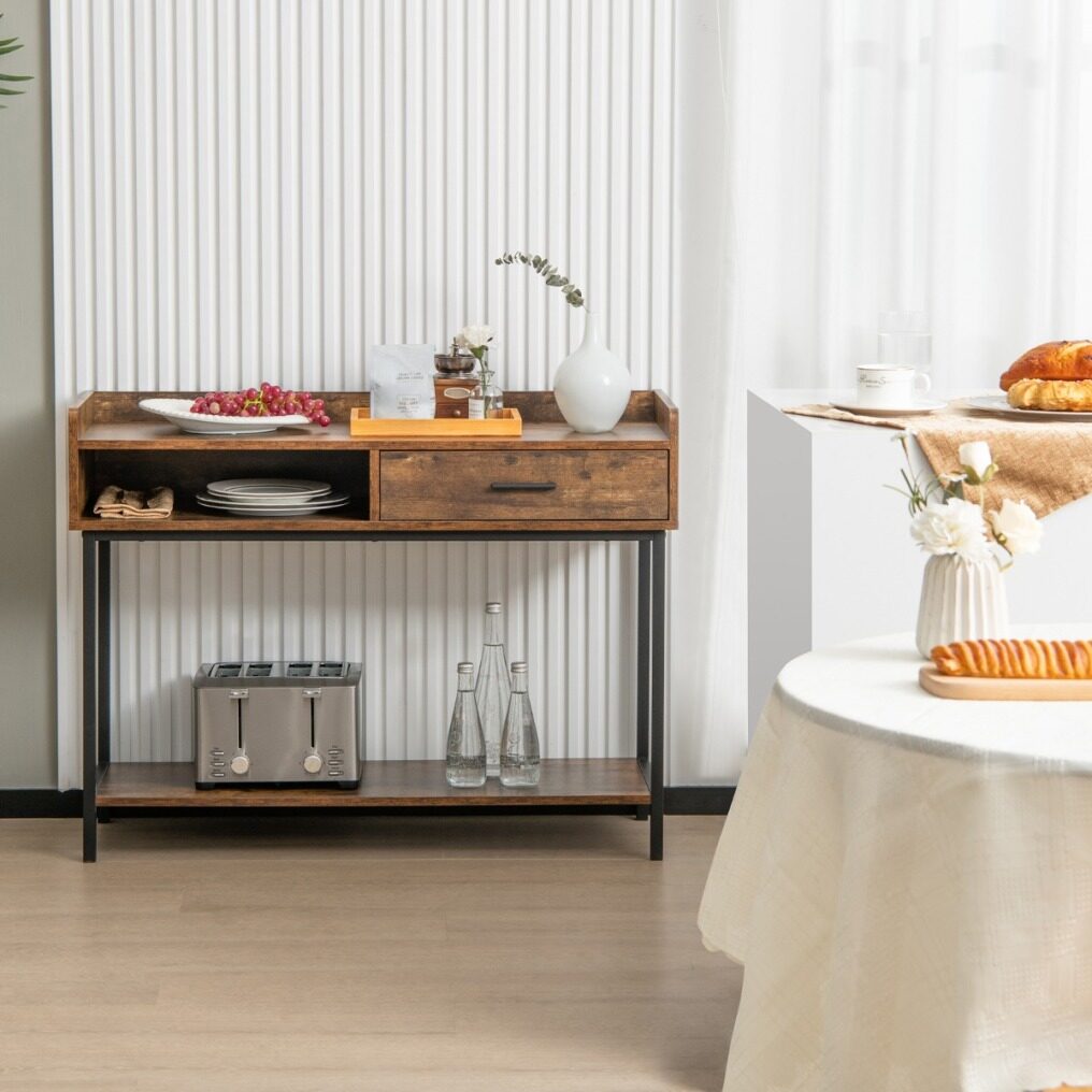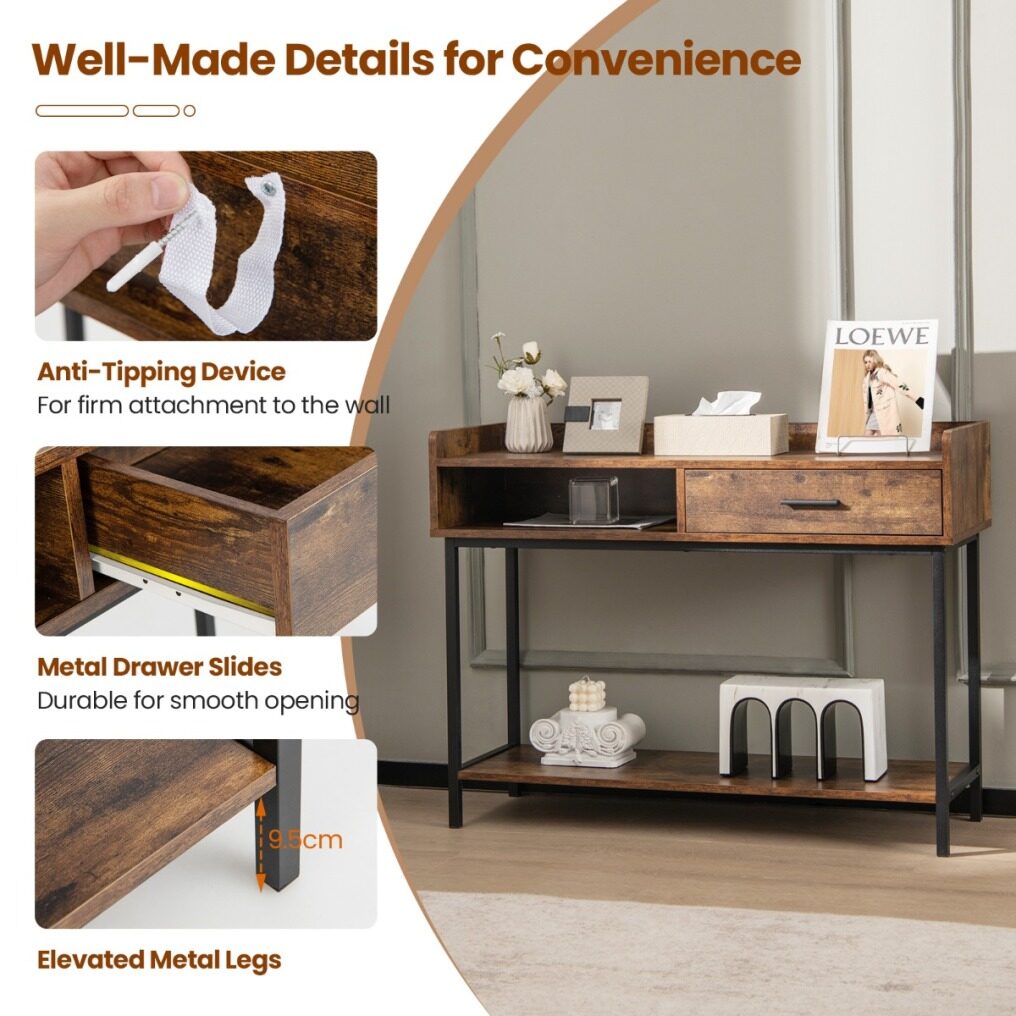 The industrial console table can meet various needs! The metal frame offers you a strong load capacity, while its anti-tipping kit avoids sudden toppling. As for storage, the couch side table with anti-slip pads has a wide tabletop, a large drawer and open shelves. Especially the tabletop is designed with an elevated edge to keep items in place. It only requires a simple installation. Then you can place it in the living room, dining room, entryway, etc.