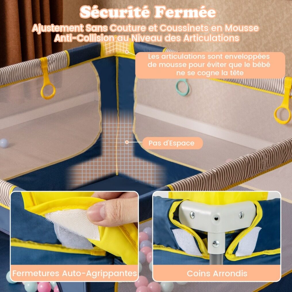 This large playard offers enough space for your little one to explore, and joints are wrapped by foam to prevent the baby from hitting the head. Parents can easily interact with their children through the see-through mesh. The play yard includes 50 ocean balls and 4 pull-up rings for physical activity and motor skills development. This foldable play pen requires no assembly, making it convenient for transport and storage with the included carry bag.