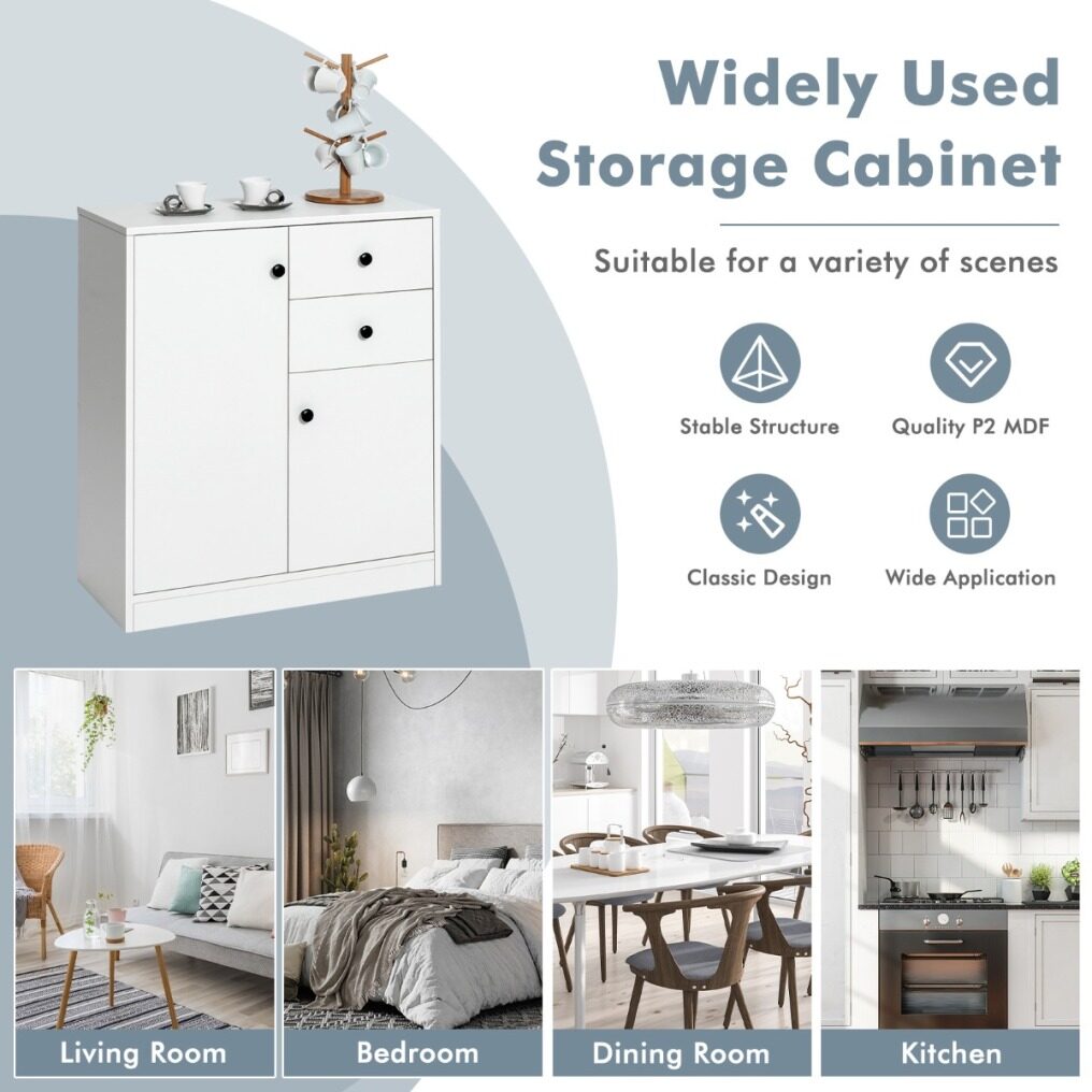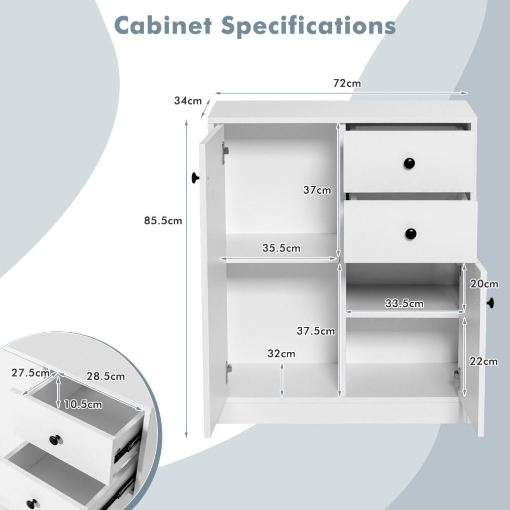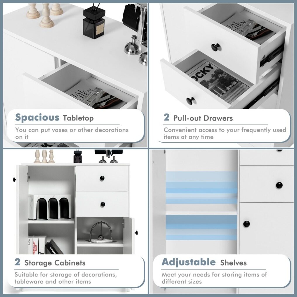 Stop settling down to the living space with clutters here and there! Add this 2-door cabinet with 2 drawer to get the sundries in a well-organized manner! The large enclosed storage space including 2 drawers and 2 cabinets protects your privacy and hide the messy sundries out of your sight, while the open tabletop serves as a good platform for displaying ornaments. Moreover, considering the specific needs, the interior shelves in the cabinet are adjustable in height to offer flexible storage options. In addition, compared with others made of flimsy boards, the storage cabinet is superior in quality and durability. And fitted with anti-toppling device, the floor cabinet can be secured to the wall for better stability. Thus, the side cabinet is definitely a good addition whether it is applied in the bedroom, living room, dining room or entryway.