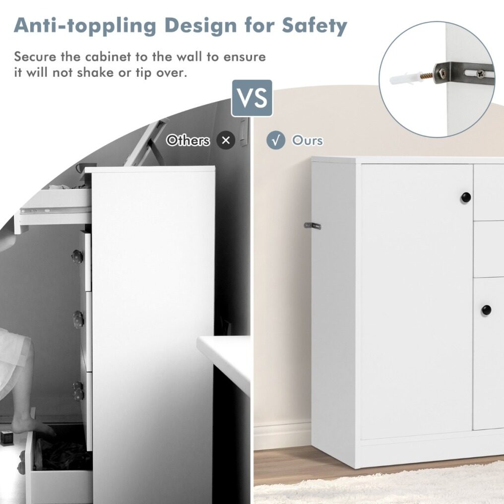Sturdy Construction & Anti-toppling Design: Made of high-quality thickened boards, the accent cabinet features a sturdy construction with a longer service life and higher load capacity. Besides, the included anti-toppling device can keep the cabinet firm in place in against of wobbling or tipping over.