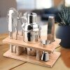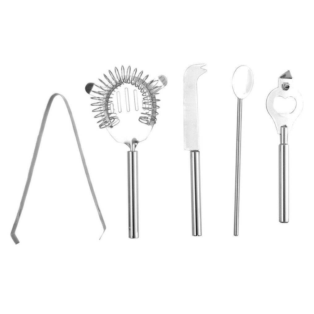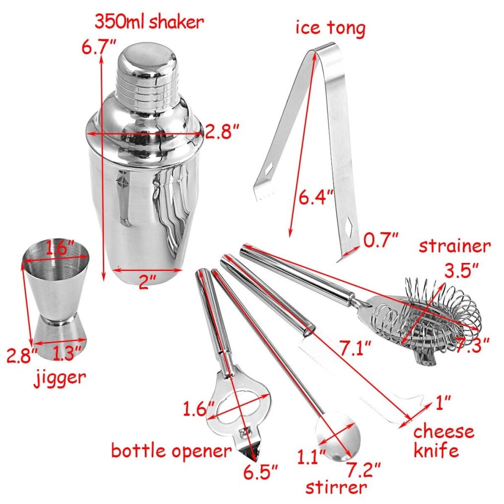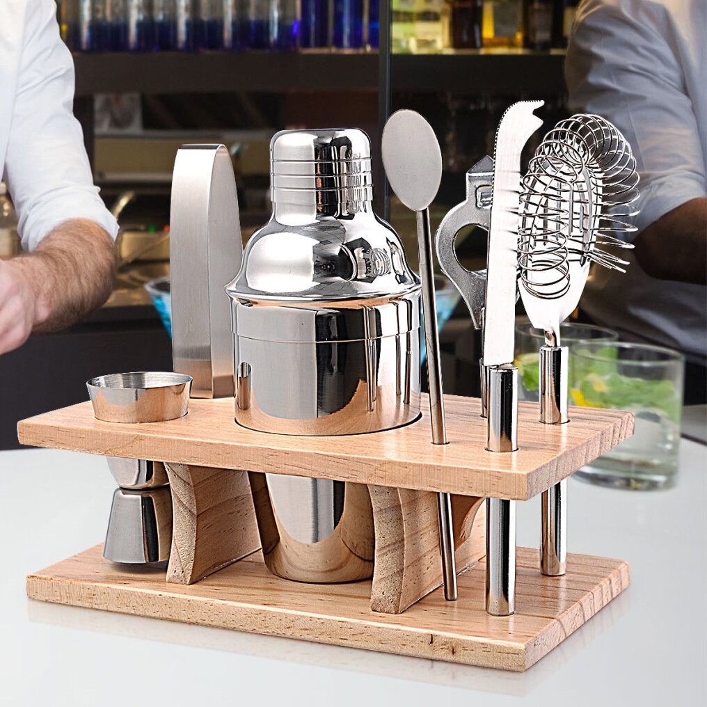 This stainless steel bar set includes a cocktail shaker, double jigger, handled strainer, lemon / lime slicing knife, stirrer, tongs, bottle opener and wood holder. It features stainless-steel material, which is durable. The wood holder can be used for storage.