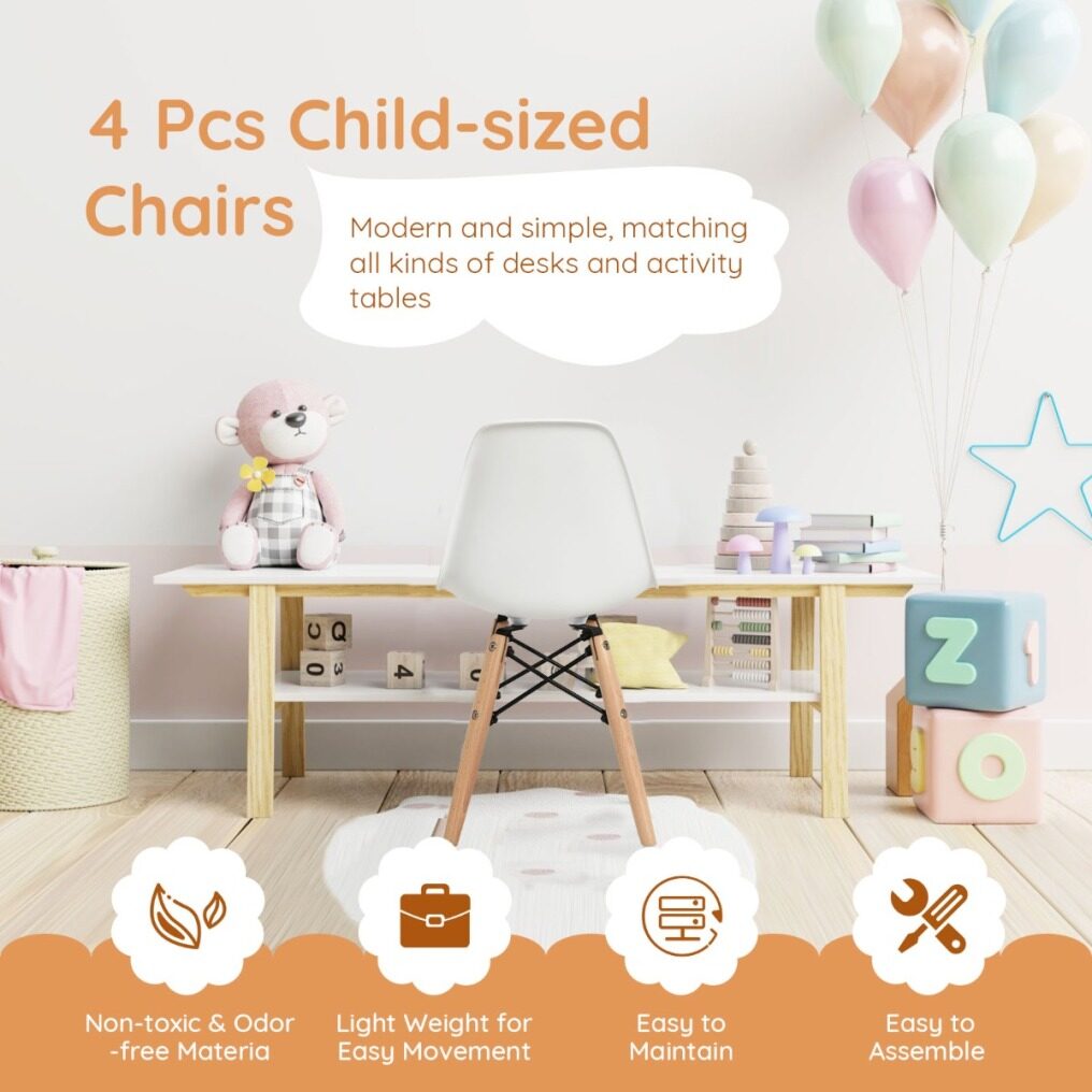 Mini DSW Chairs for Kids: Include 4 pieces of children’s side chairs. This set of kids’ desk chairs has a cute and modern appearance that is liked by kids and warmly welcomed by parents. It is recommended for kids over 3 years old.