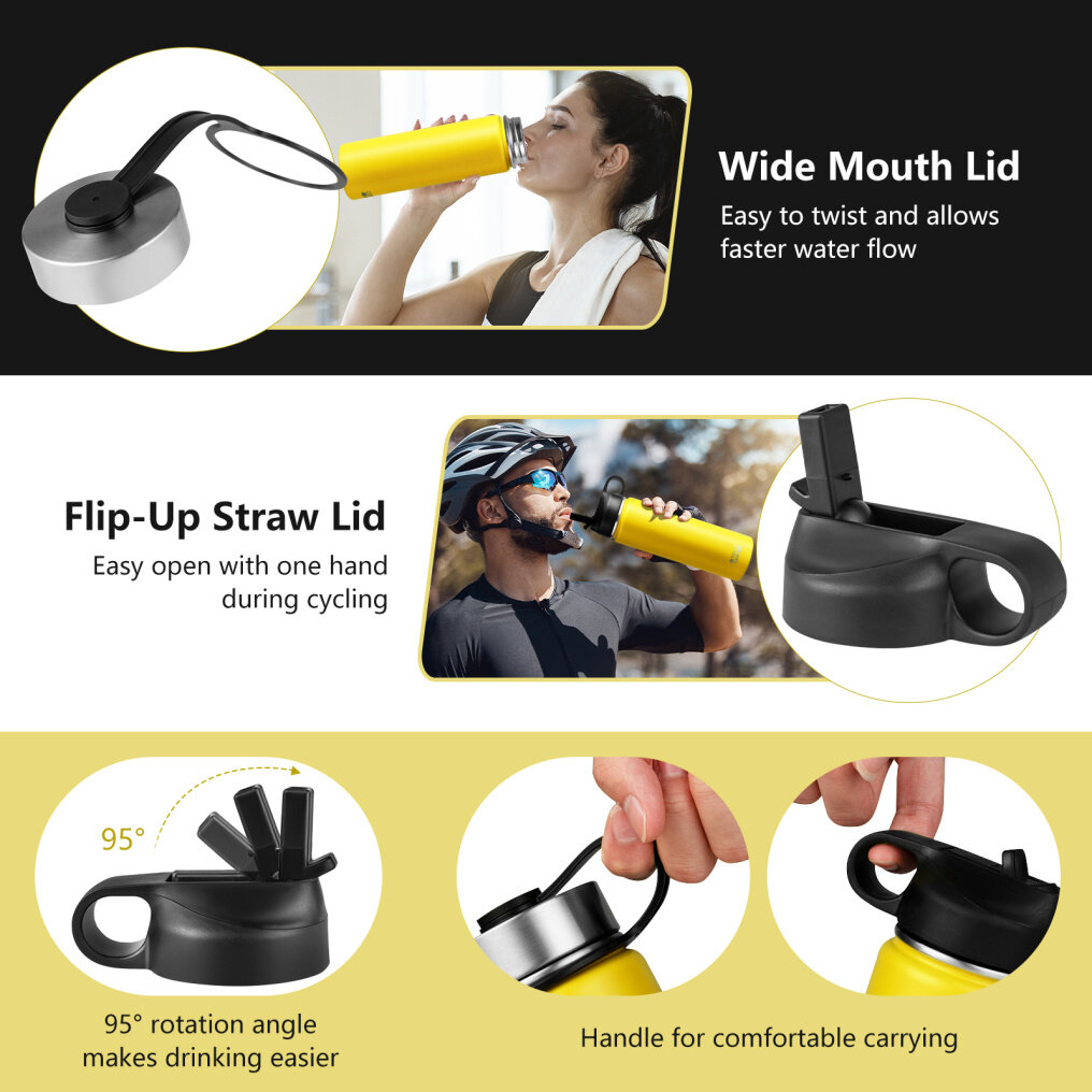 Design with 2 Functional Lids:  The water flask comes with 2 different lids for you to choose from 1 wide mouth lid and 1 flip-up straw lid. 2.16" wide mouth opening ensures quick drinking and convenient fill-up. Additionally, the 95-degree flip makes it easy to drink. And straw design allows convenient drinking when you do sports.
