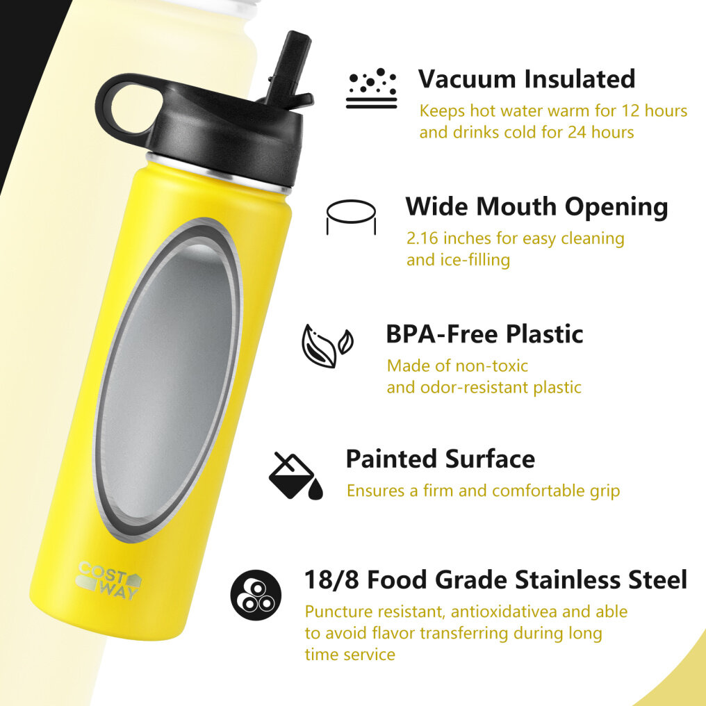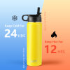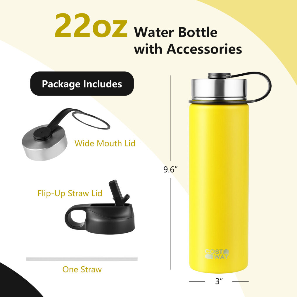 22 Oz Double-walled Insulated Stainless Steel Water Bottle with 2 Lids and Straw-Yellow