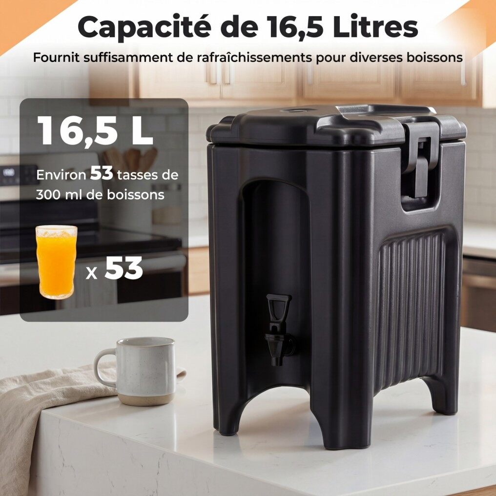 Discover this beverage dispenser that combines performance and practicality for all your occasions. Its triple-layer insulation keeps drinks cold for 4 to 6 hours and hot for 6 to 8 hours. With a 16.5-liter capacity, it can serve up to 53 330ml cups. Leak-proof and fresh thanks to the silicone seal and vent cap, and a drip-free tap for spill-free serving. Operating without electricity, this insulated container is ideal for both indoor and outdoor use. Lightweight and robust, it features ergonomic handles and a secure stacking system for easy transport and storage.