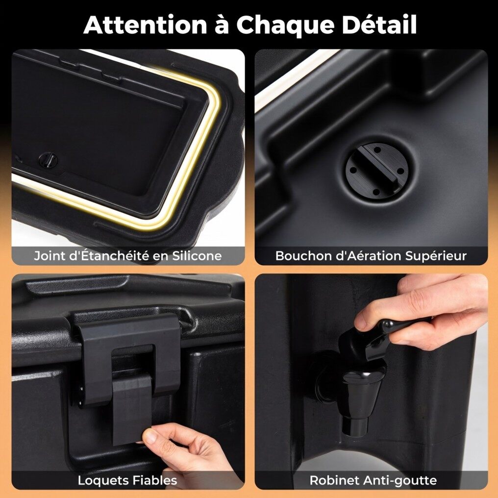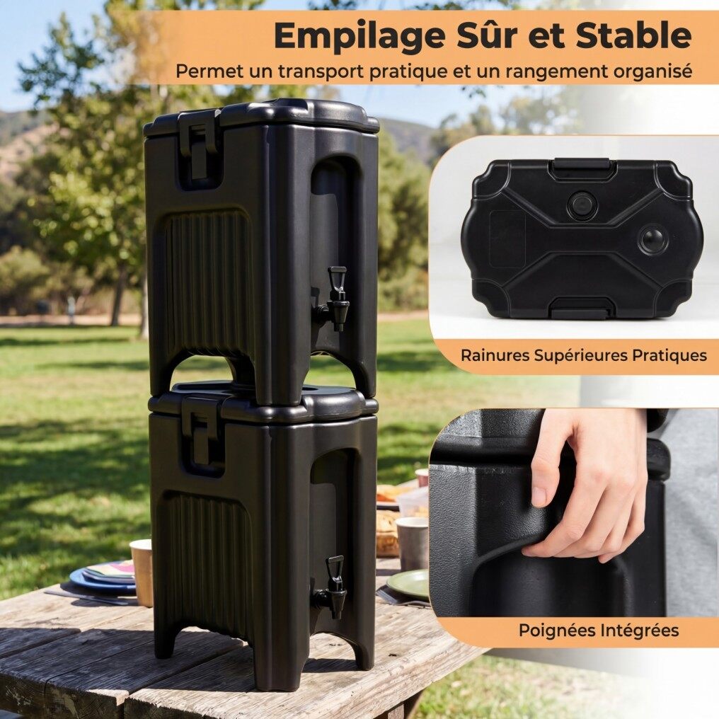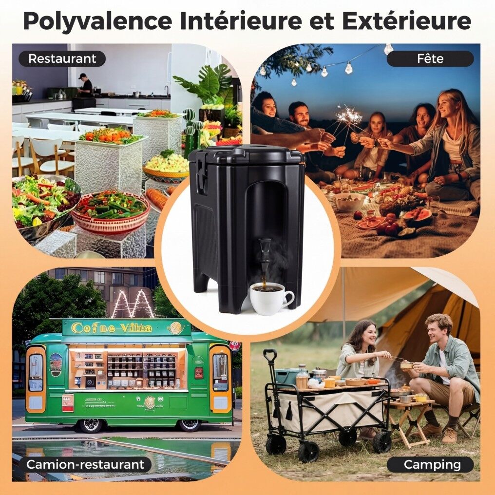 【Suitable for All Environments】Operating without electricity, this insulated container is perfectly suited for both indoor and outdoor use. Whether for a restaurant, food truck, outdoor party, or camping trip, it ensures a smooth service of hot or cold drinks, wherever you are.