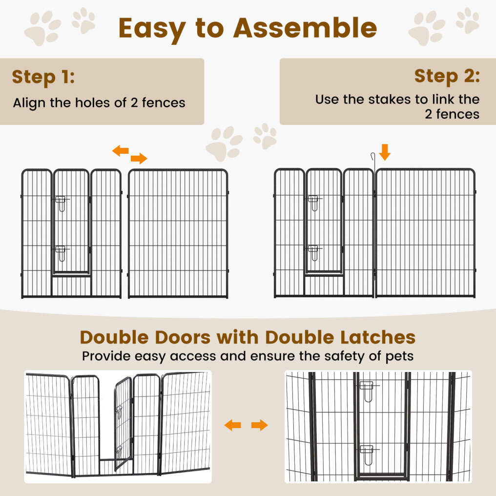 Easy to Assemble: To set up this adjustable panel is a breeze, which only needs 3 simple steps. STEP 1: Align the holes of 2 panels. STEP 2: Use the stake to through the 2 panels. STEP 3: Push the door latch and lock. Plus, it can be folded to save space.