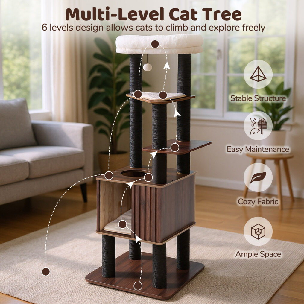 Multi-Level Cat Tree: This stable cat tree comes with 6 levels, which encourages natural climbing and exploring behaviors in cats. Besides, the thickened board and sturdy supporting posts allow cats to climb and play safely among multiple platforms.