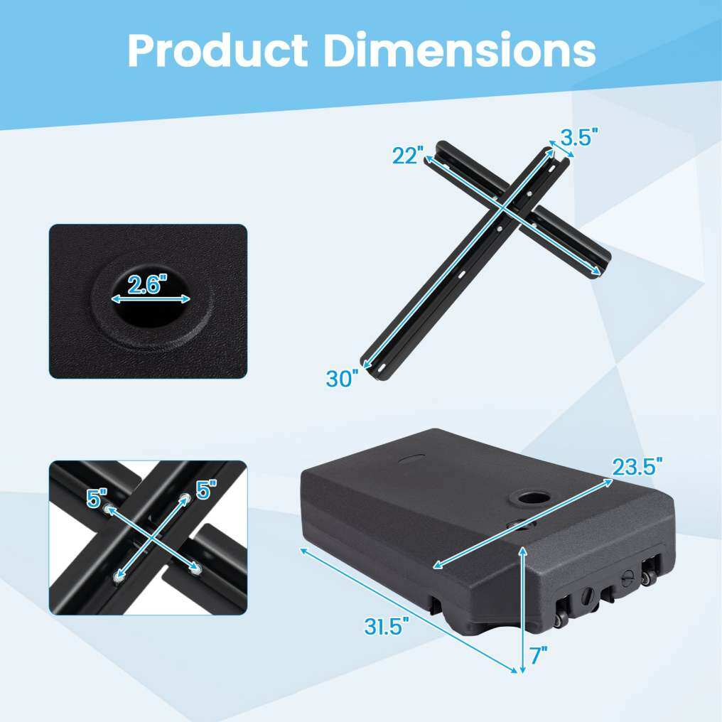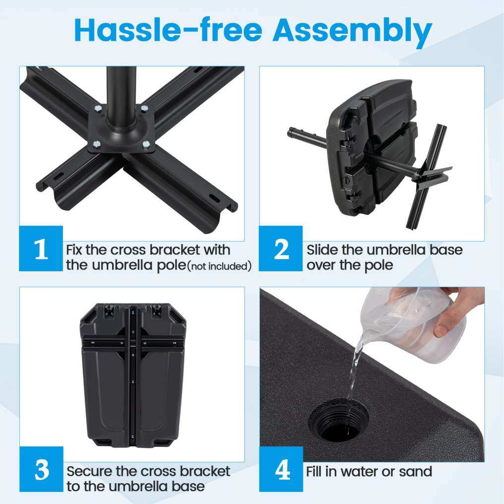 ● Wide Compatibility: Featuring a universal cross bracket, the weighted stand accommodates 10 ft cantilever umbrellas and supports pole diameters up to 2.6", ensuring a secure fit for a variety of outdoor umbrella styles.