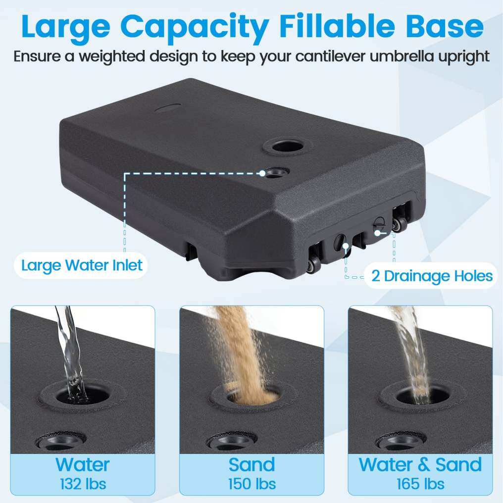 ● Large Capacity Reservoir: Designed with a spacious refillable reservoir, the cantilever umbrella base can be loaded with up to 132 of water, 150 lbs of sand, or 165 lbs of a sand & water mixture. Hence, it will offer ultra-secure stability to keep your umbrella firmly in place in breezy conditions.