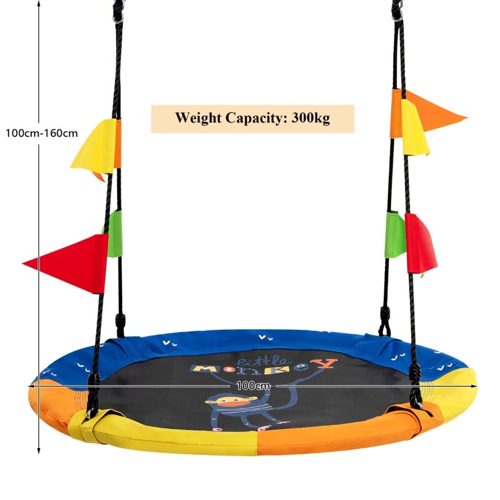 Exquisite Patterns & Pretty Flags: There is a really cute cartoon monkey/horse/helicopter figure designed in the middle of the saucer, which makes the flying swing much more attractive to your kids and they will surely fall in love with this swing and be willing to spend time playing on it. Moreover, the colourful flags also decorate the swing and make it more beautiful to create an energetic place for playing.