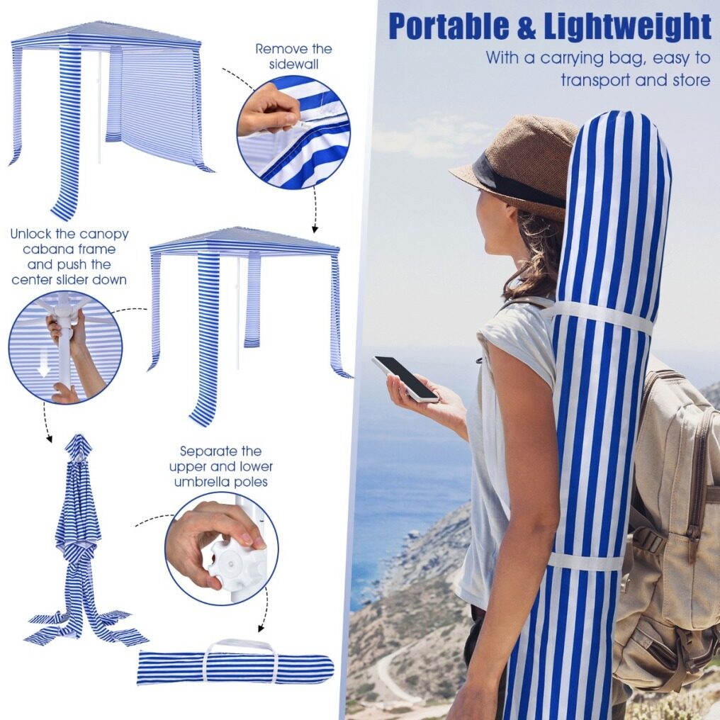 Our 202 x 202x 233 cm portable beach cabana provides a large shaded area for you to enjoy leisure time with your family or friends, and there exists a detachable sidewall to provide extra shade and privacy, meeting your multiple needs. The beach canopy is made of sun-protection and waterproof polyester fabric and supported by a heavy-duty steel frame to provide strong support, ensuring long-lasting outdoor use. Moreover, our canopy is easy to set up, even for one person, and you can store it in a carrying bag when not in use. The compact and lightweight carrying bag allows you to transport and store it effortlessly. It can be set up almost anywhere such as on the sand, grass, or in the backyard as a pool cabana. But please firmly fix the extension pole with the anchor (insert into the sand, grass, or weighted base) and add heavy items to the sandbags for ensuring great stability.